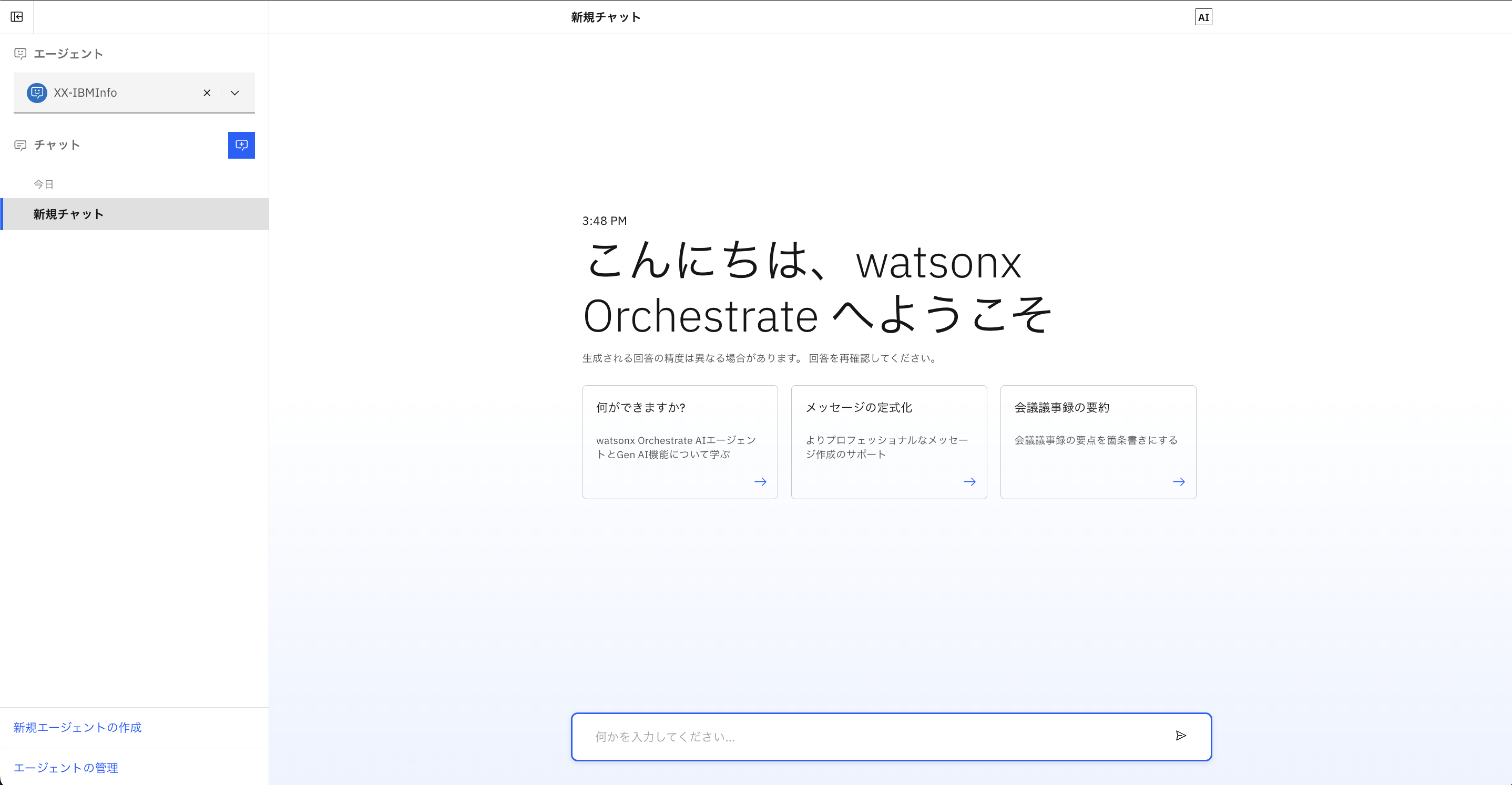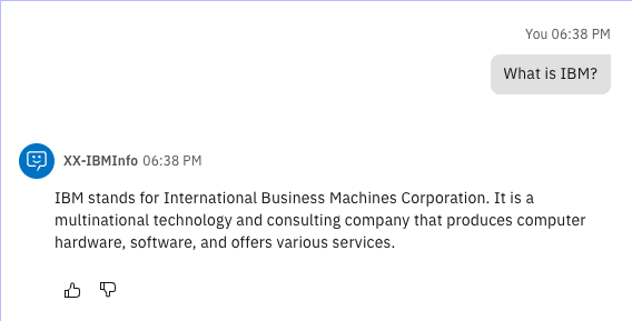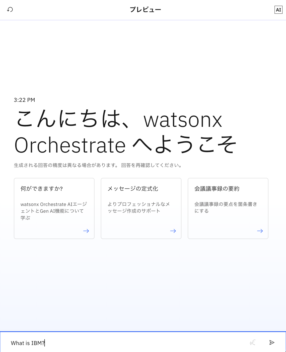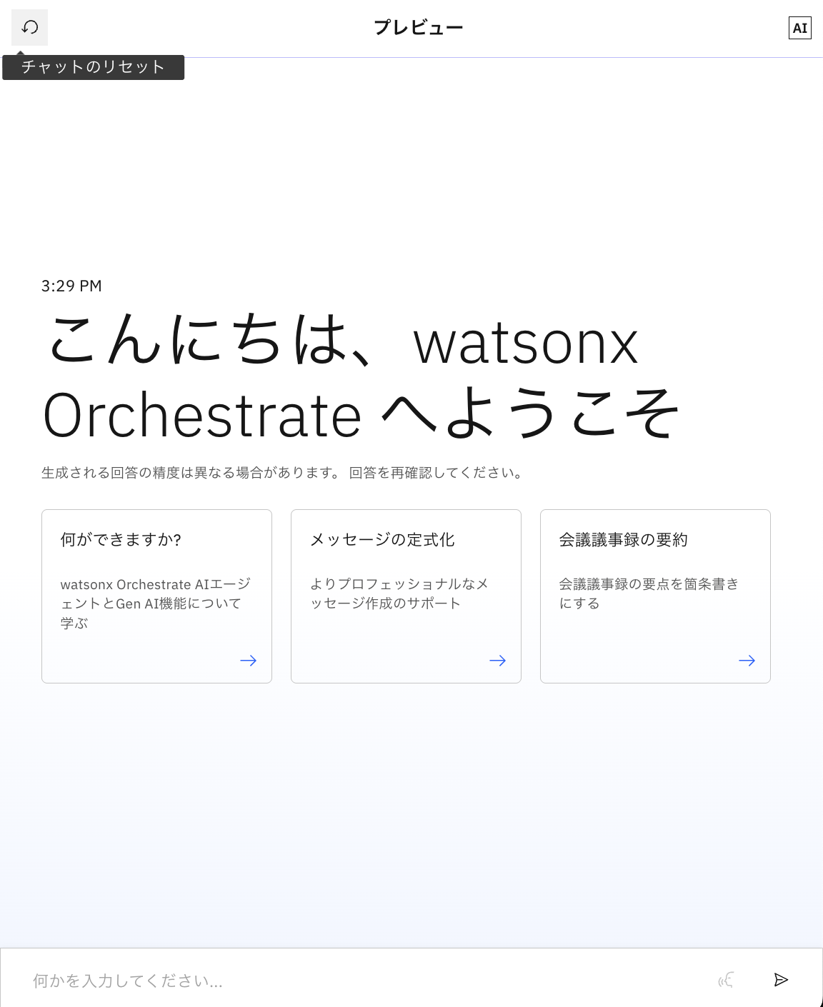 watsonx Orchestrateが先ほど読み込んだファイルの内容をもとに、適切な回答を行っていることが確認できます。