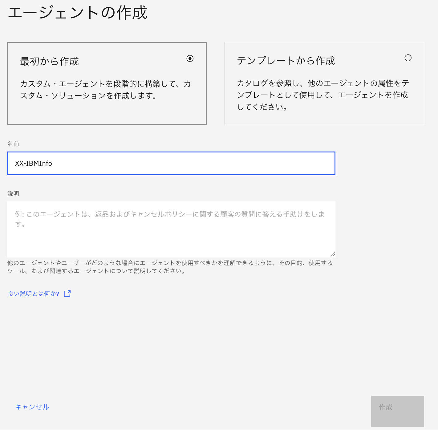 このハンズオンでは、DescriptionにIBMの会社情報に関する質問に回答するエージェントですと設定し、作成をクリックします。