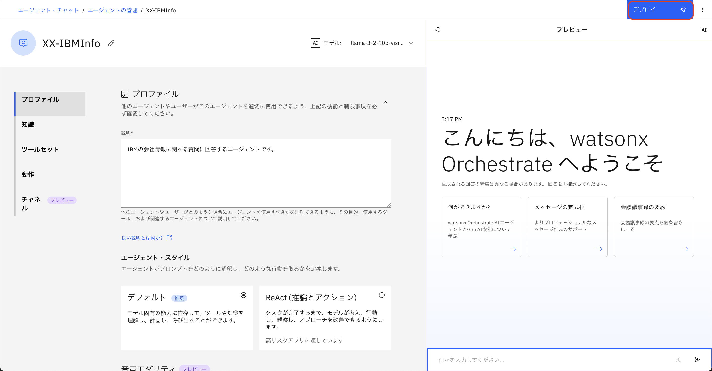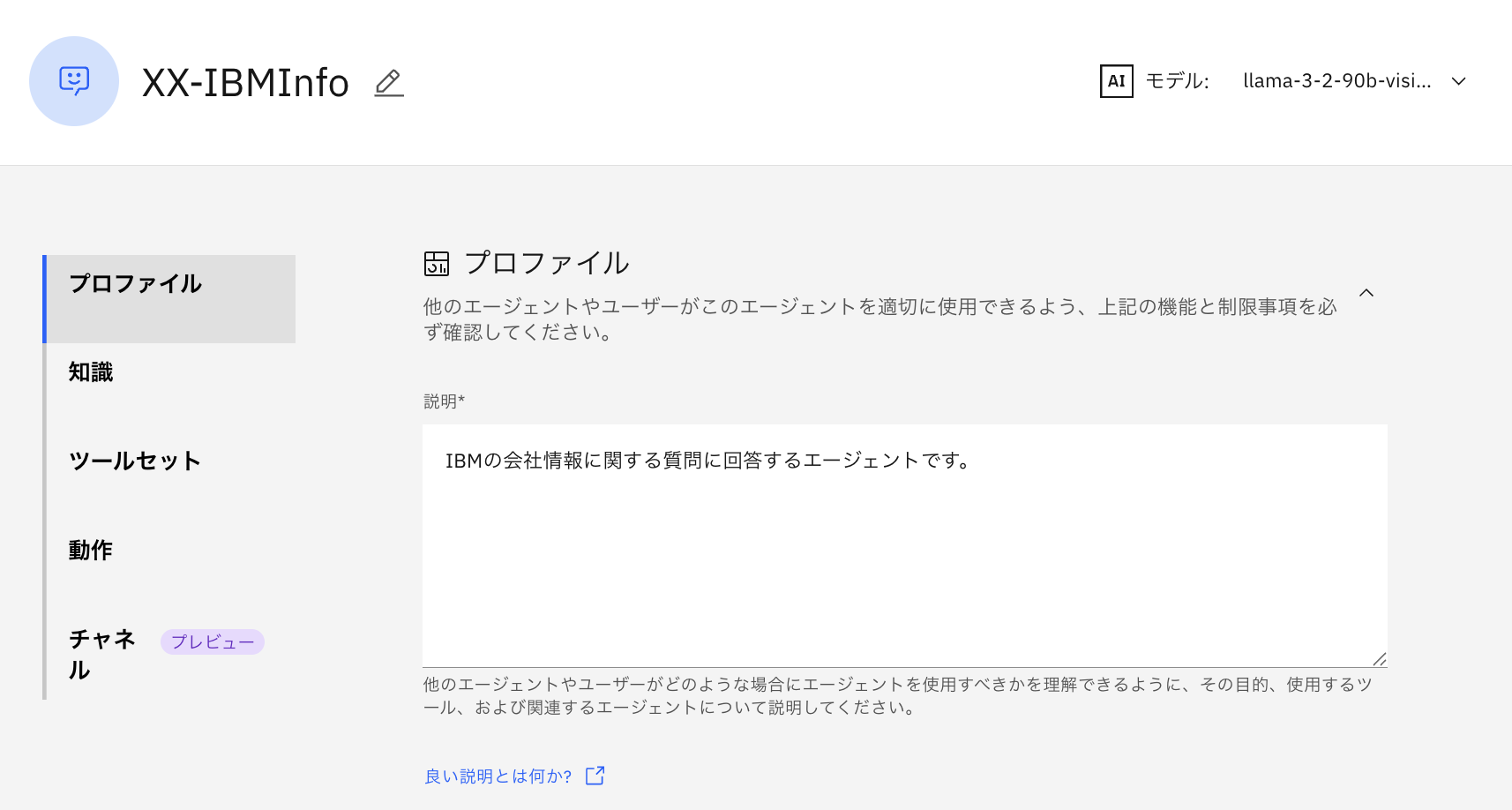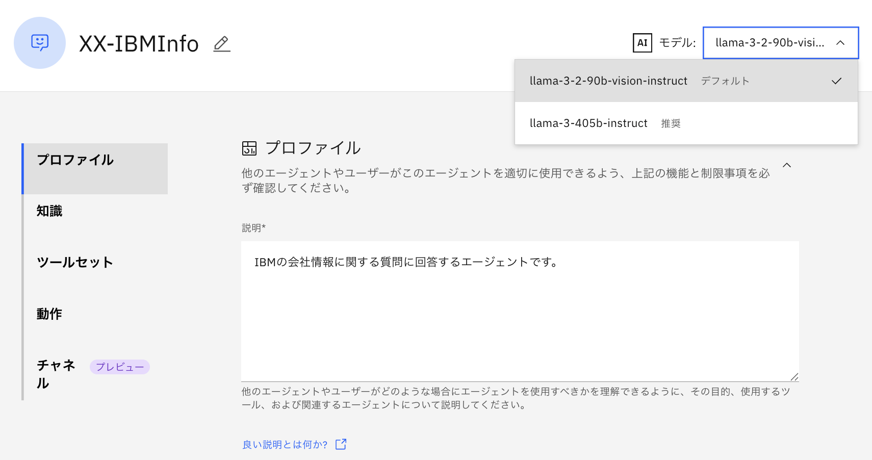 このハンズオンではIBMに関する質問に回答するエージェントを作成するため、NameをYourInitials-IBMInfoと設定します。