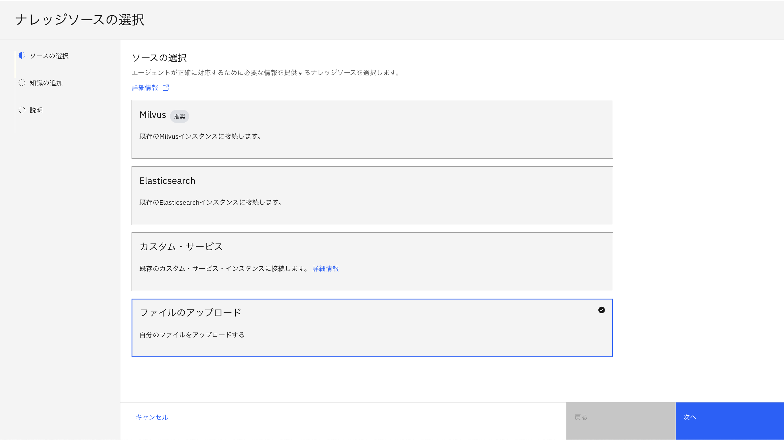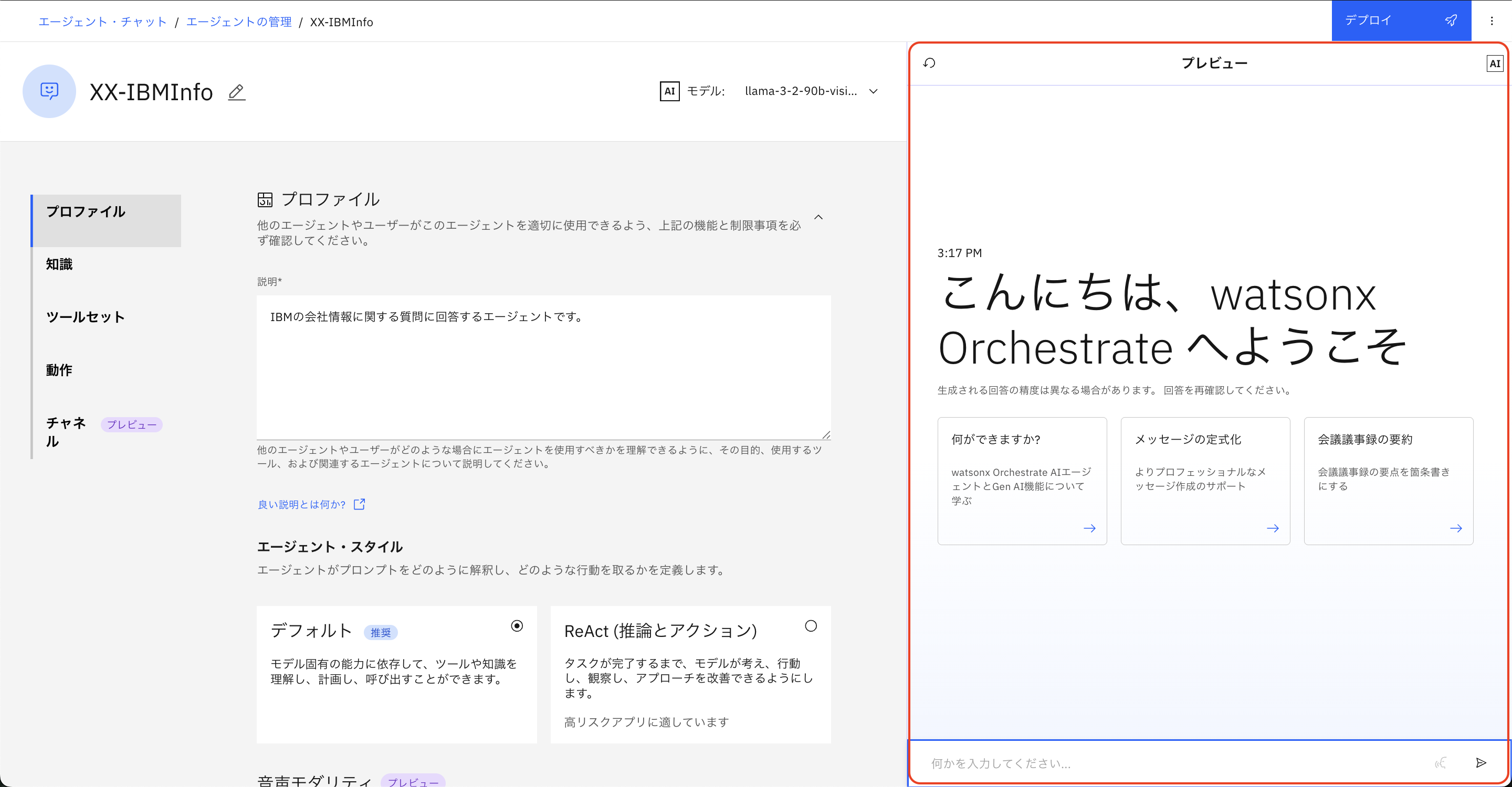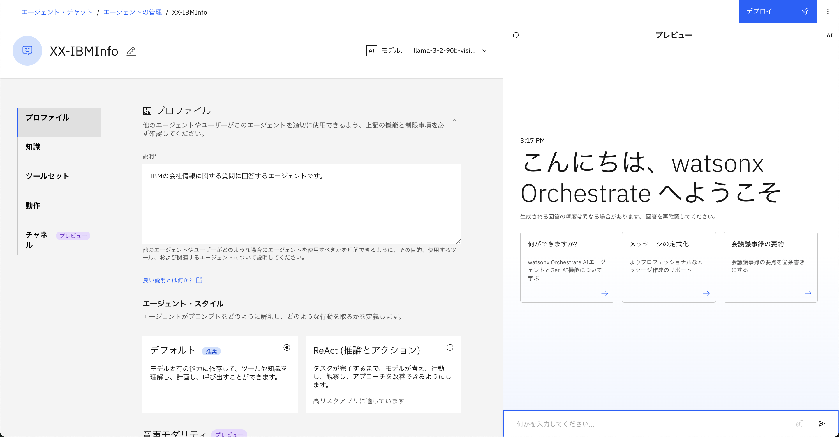 このハンズオンではIBMに関する質問に回答するエージェントを作成するため、NameをYourInitials-IBMInfoと設定します。