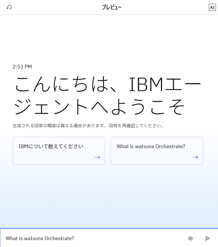 プレビューチャットにIBMについて教えてくださいと入力します。もしくはスタータープロンプトのIBMについて教えてくださいをクリックします。