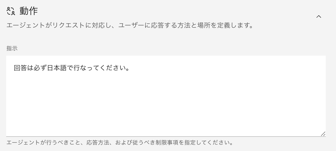 ユーザーが使いやすいよう利用ユーザーに合わせた動きを行うために、動作に応答の定義を行います。このハンズオンでは、日本人を対象としたAgentの作成のために、回答は必ず日本語で行ってくださいと入力します。