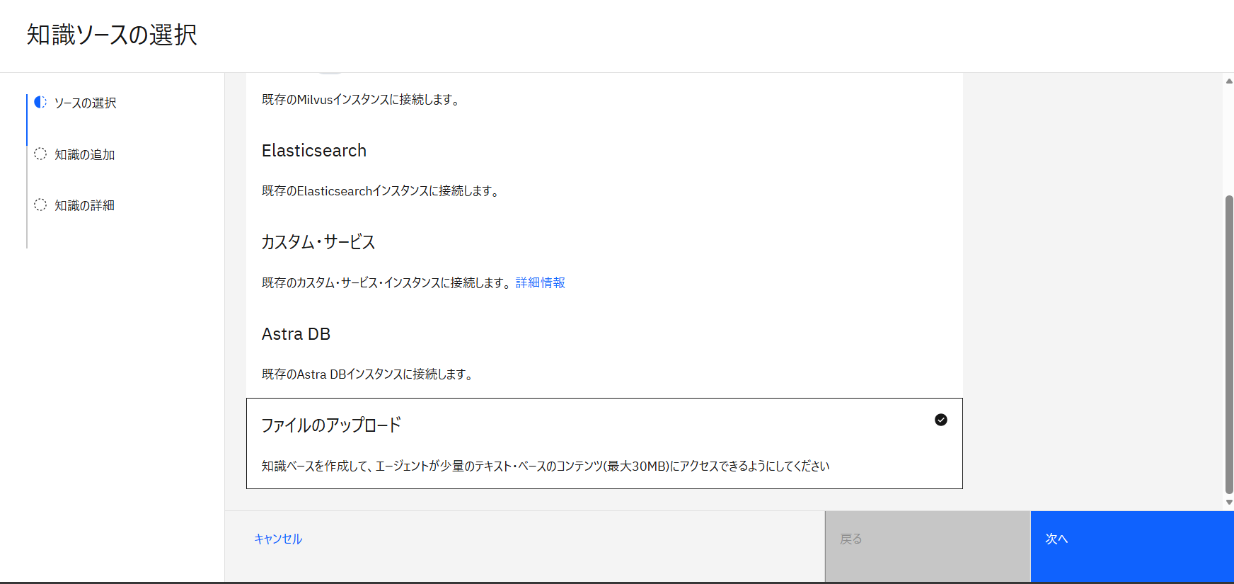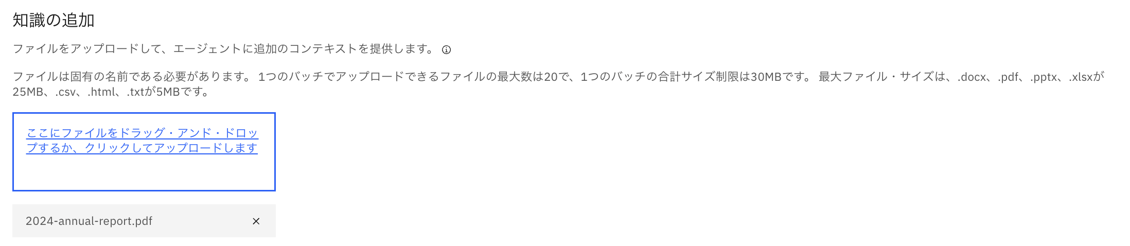 watsonx Orchestrateは組み込みのRAG (Retrieval Augmented Generation) 機能を提供し、エージェントごとにドキュメントをアップロードすることで、その内容をもとに回答を生成することが可能です。