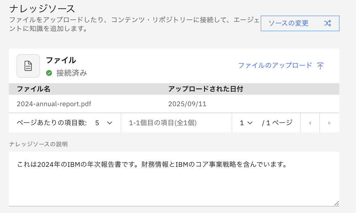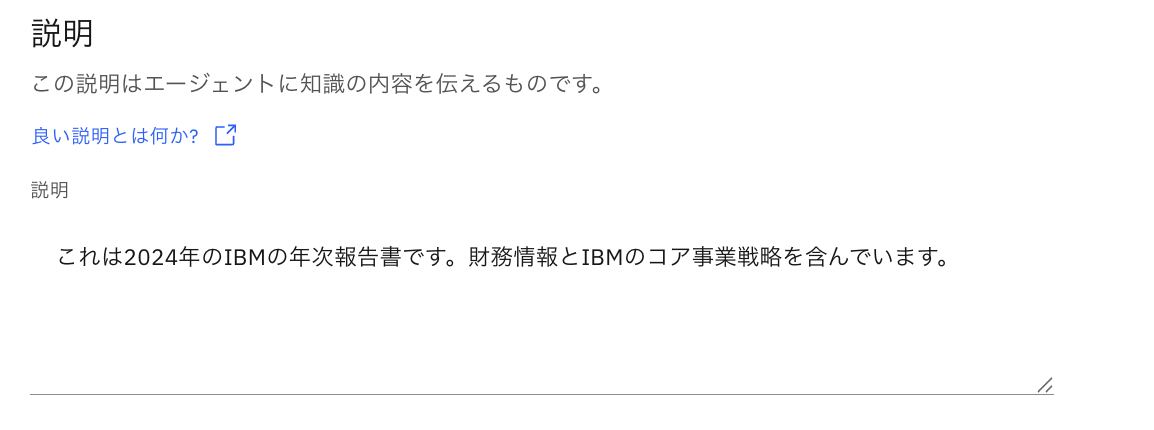 エージェントが適切なタイミングで知識を使用するために、読み込むファイルがどのようなものであるかを定義する必要があります。 今回は、説明にこれは2024年のIBMの年次報告書です。財務情報とIBMのコア事業戦略を含んでいますと入力し保存ボタンをクリックしてください。