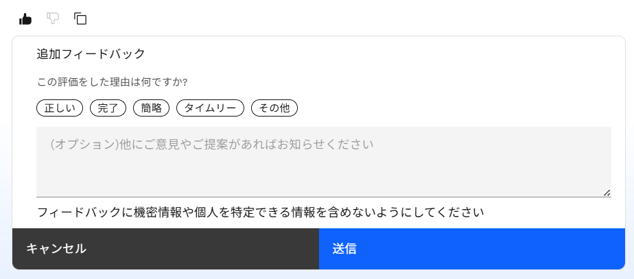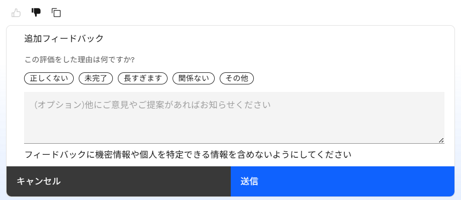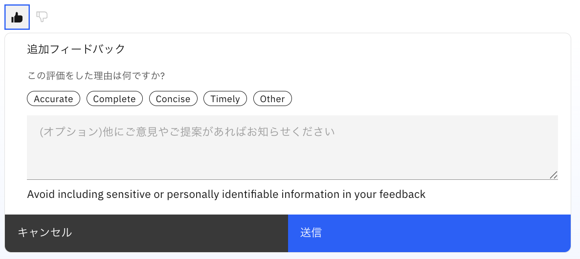 ユーザーからのフィードバックを元に、回答を改善することも重要です。watsonx Orchestrateではユーザーのフィードバックを受け付ける機能を提供します。どの様なフィードバックが可能かを見てみましょう。