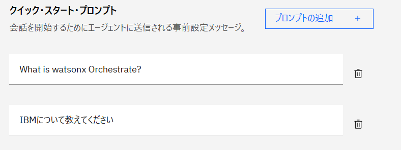 続いて、スタータープロンプトにあるデフォルトの設定を削除します。削除後、プロンプトの追加ボタンをクリックします。What is watsonx Orchestrate?と入力後、再度プロンプトの追加ボタンをクリックし、もう一つ追加します。IBMについて教えてくださいと入力してください。 スタータープロンプトを設定することで、ユーザーはここをクリックすることで会話を始めることができるようになります。