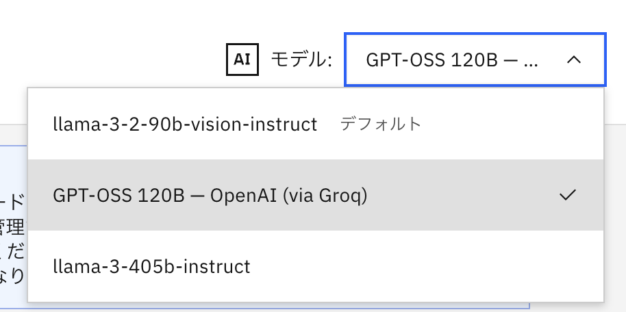 デフォルトでLLMが選択されています。現在のバージョンでは、llama-3-2-90b-vision-instructが選択されています。