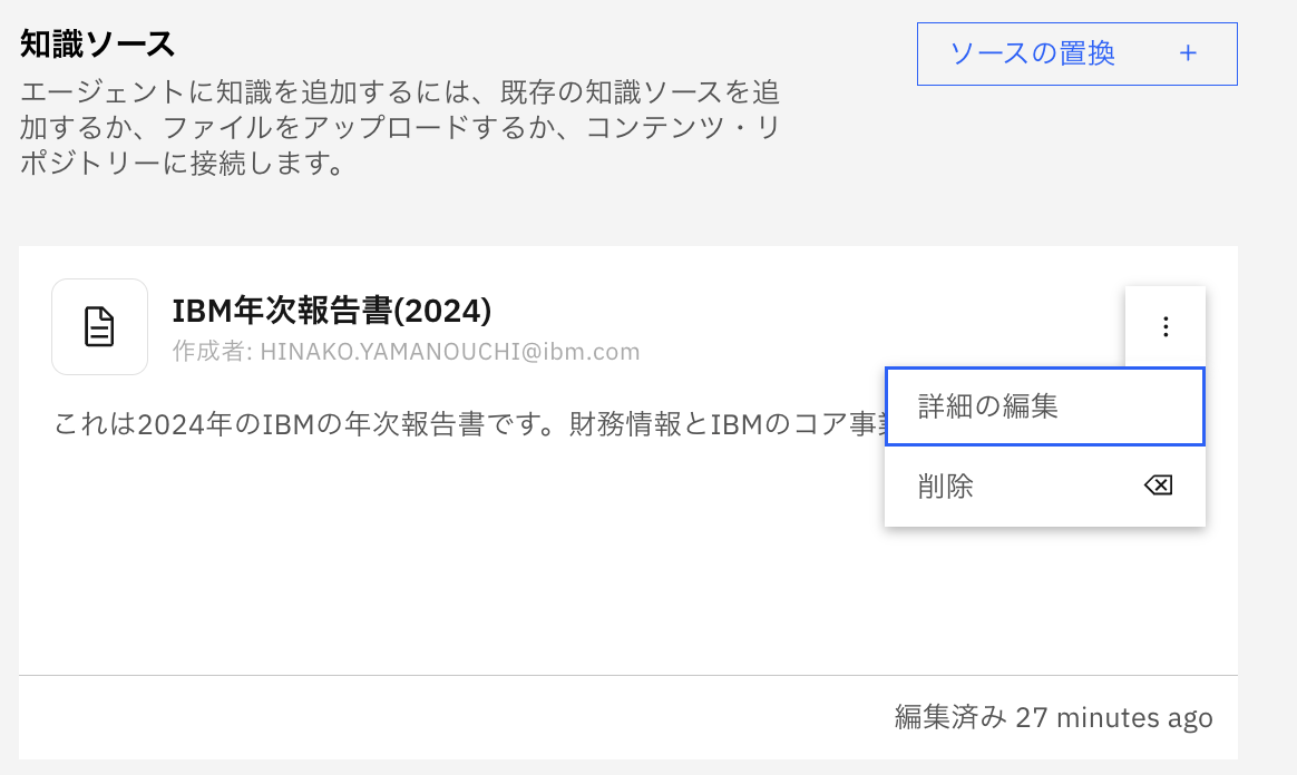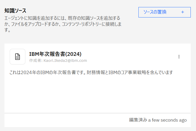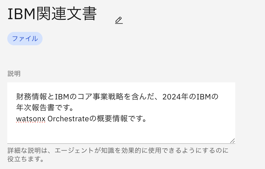 アップロード完了後、先程設定した名前をIBM関連文書に更新します。また説明についても財務情報とIBMのコア事業戦略を含んだ、2024年のIBMの年次報告書です。watsonx Orchestrateの概要情報です。と更新します。