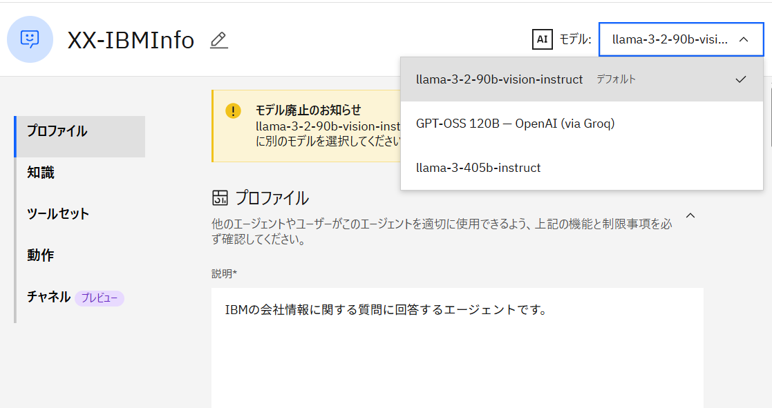このハンズオンではIBMに関する質問に回答するエージェントを作成するため、名前をYourInitials-IBMInfoと設定します。