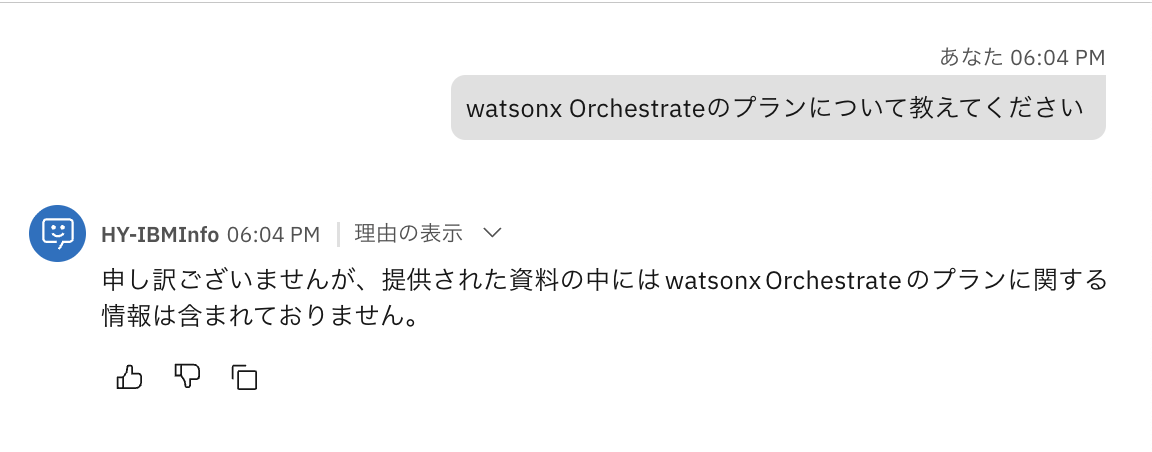 チャット画面で、watsonx Orchestrateのプランについて教えてくださいのように入力してください。正しい回答は得られないはずです。