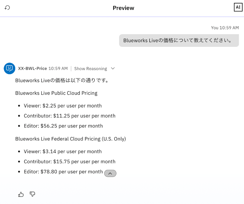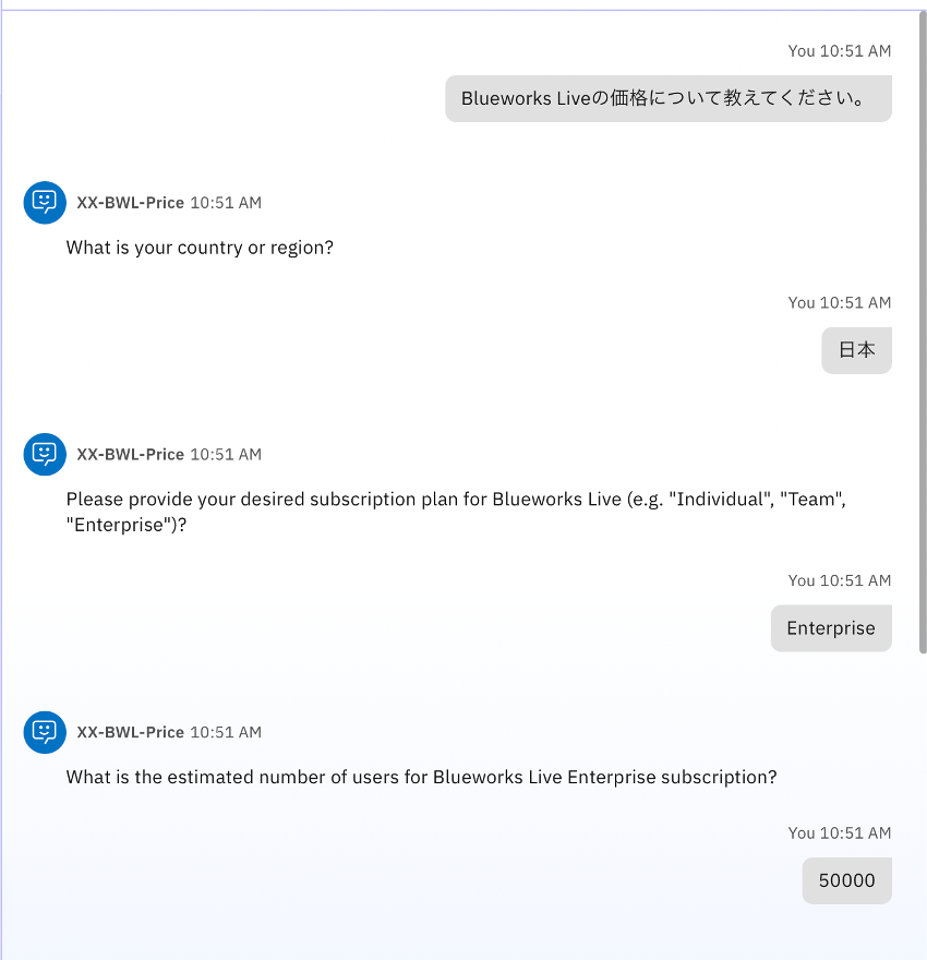 チャット画面で、Blueworks Liveの価格について教えてくださいのように入力してください。AIから何度か回答までに質問が繰り返されますが、正しい回答は得られないはずです。
