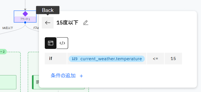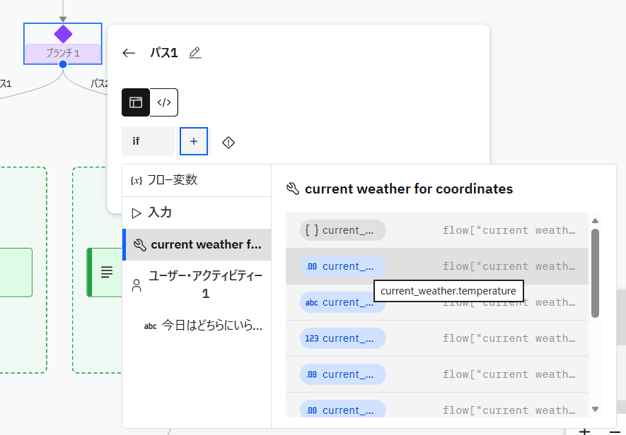 current weather for coordinatesと出力の間の矢印にカーソルを合わせ、+マークをクリックします。表示されたメニューから フロー制御を追加する → ブランチ を選択します。