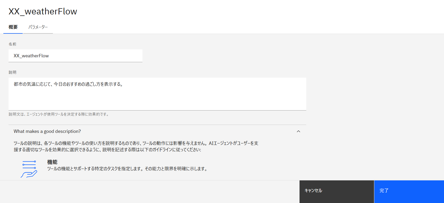 AIエージェントが正しくフローを呼び出せるように、フローの説明を 都市の気温に応じて、今日のおすすめの過ごし方を表示する。 と書き換えて、完了 をクリックします。