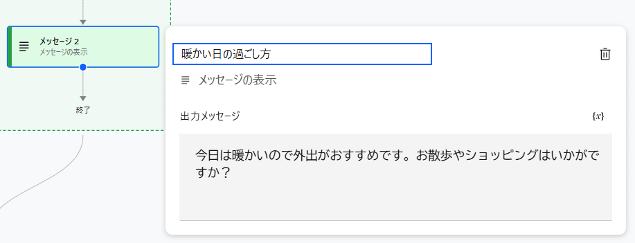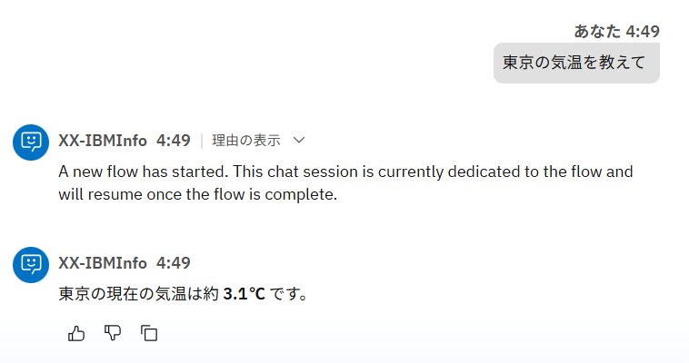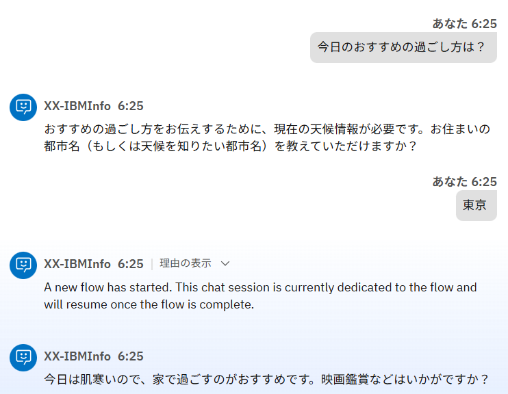 ただ、上記の設定だけではフローの実行後にLLMが独自で考えた過ごし方の提案も行われることが多くあります。もしそちらをなくしたい場合は、動作に XX_weatherFlowの実行完了後は、追加の出力を一切行わずに会話を終了してください。 と追加すると改善されることがあります。 GPT-OSSモデルへの効果的な指示の与え方は、こちらもご参照ください。
