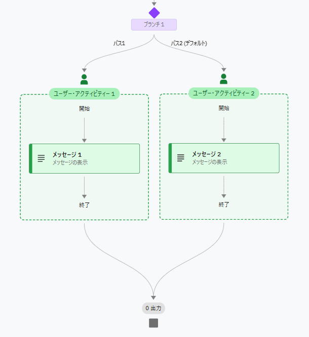 パス2の Add をクリックし、表示されたメニューから同じく ユーザーに提示する → メッセージ を選択します。2つのメッセージは見やすいようにドラッグ&ドロップで位置を調整してください。