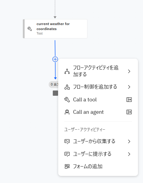 画面左上の + アイコンをクリックし、ツールタブを選択します。検索ボックスに weather と入力し、表示された current weather for coordinates を 開始 と 終了 の間にドラッグ&ドロップします.