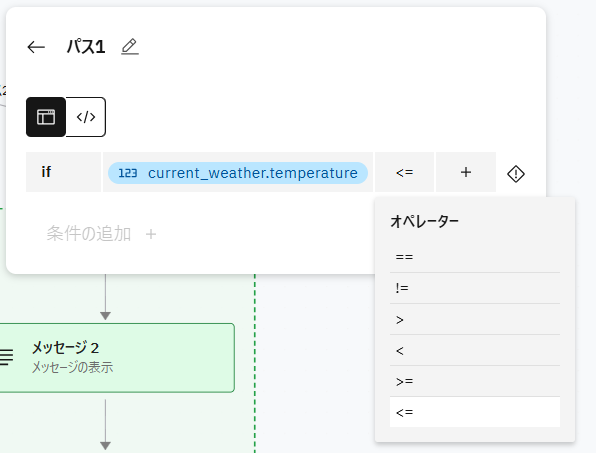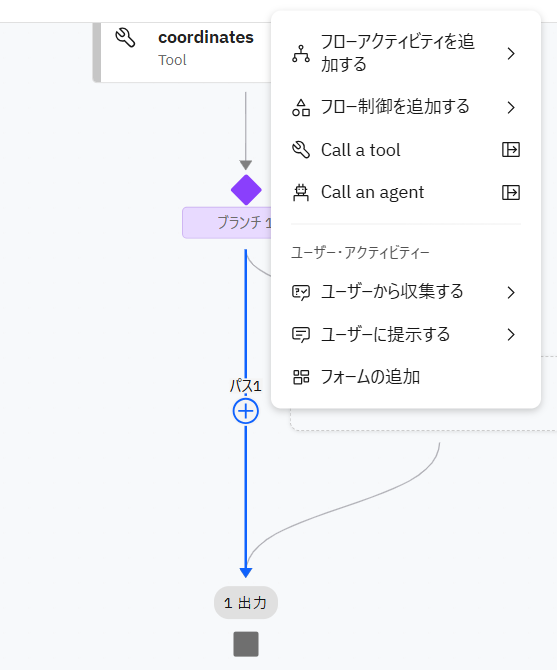 追加したブランチ1と出力の間の矢印(パス1)にカーソルを合わせて+マークをクリックし、表示されたメニューから ユーザーに提示する → メッセージ を選択します。