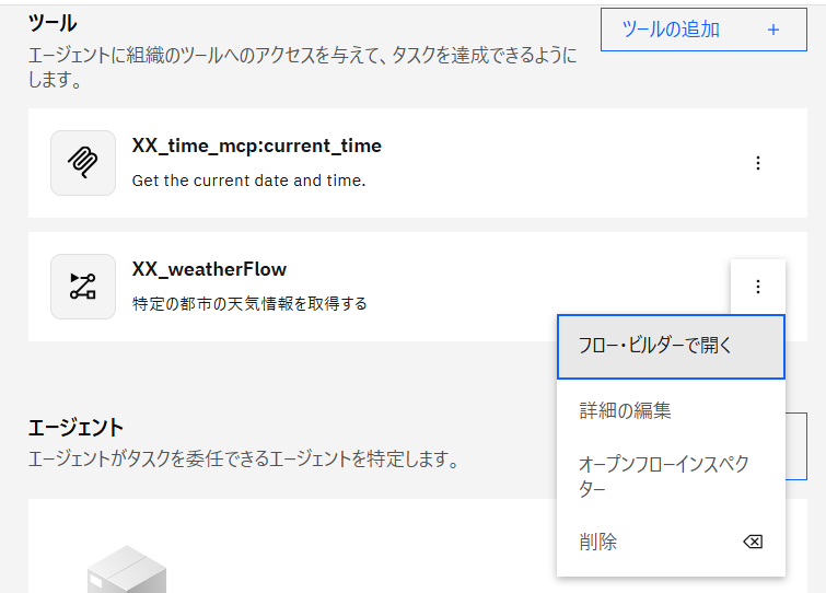 検索ボックスにXX_weatherと入力し、表示されたXX_weatherFlowのチェックボックスを有効にして エージェントに追加 ボタンをクリックします。
