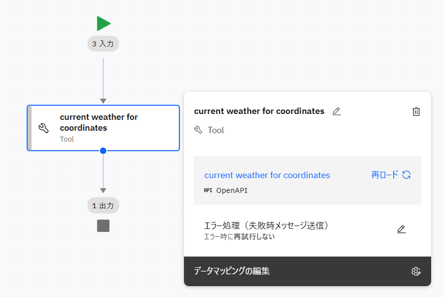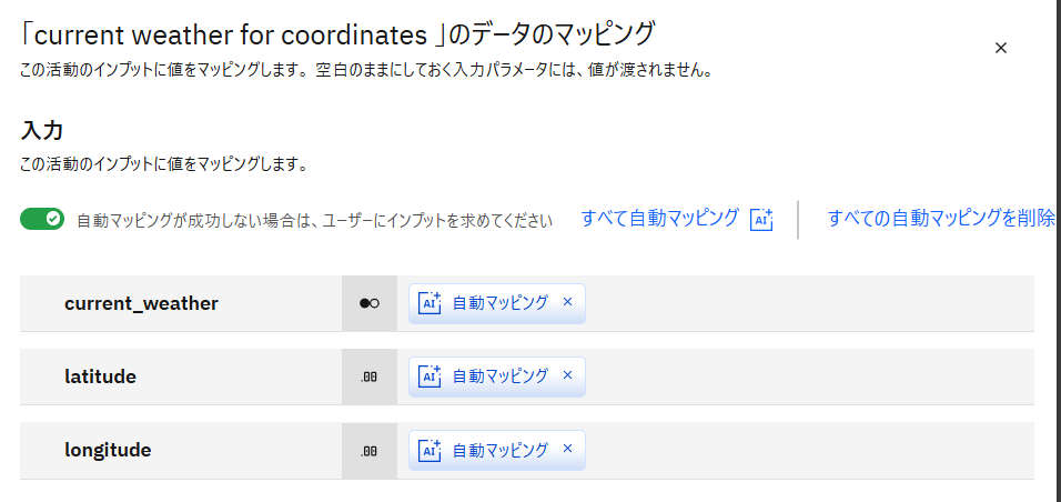 配置したcurrent weather for coordinatesをクリックし、表示された データマッピングの編集 をクリックします。