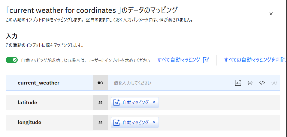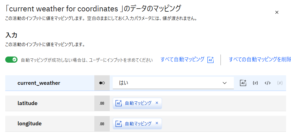 current_weatherにはオート・マップではなくtrueを設定するため、オート・マップ の×をクリックして削除します。