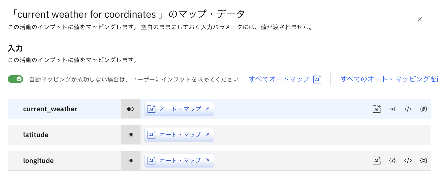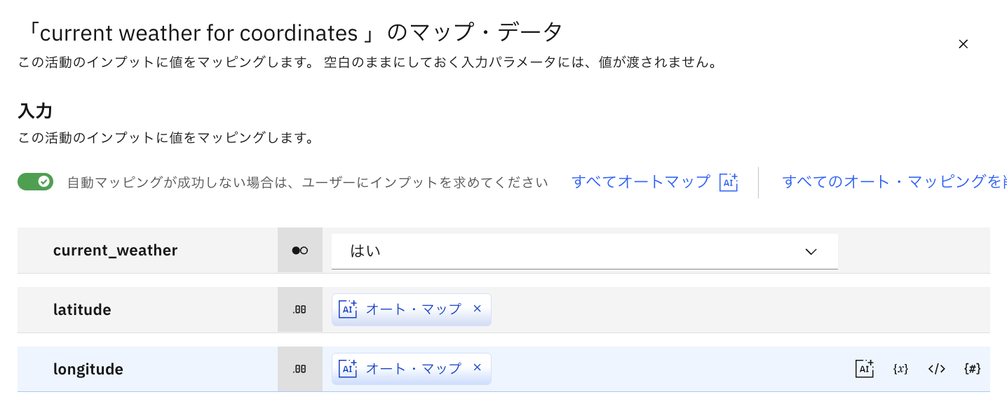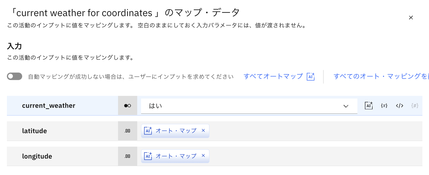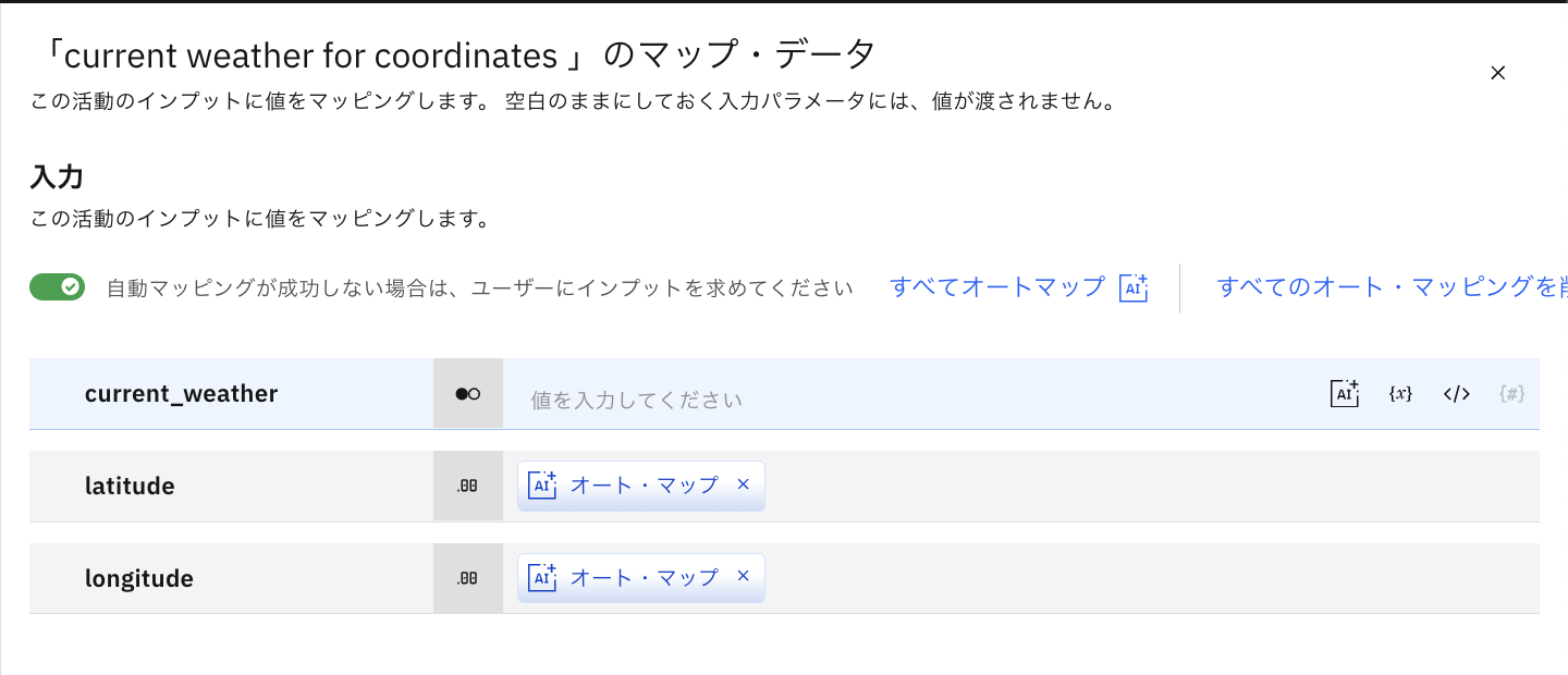 current_weatherにはオート・マップではなくtrueを設定するため、オート・マップ の×をクリックして削除します。