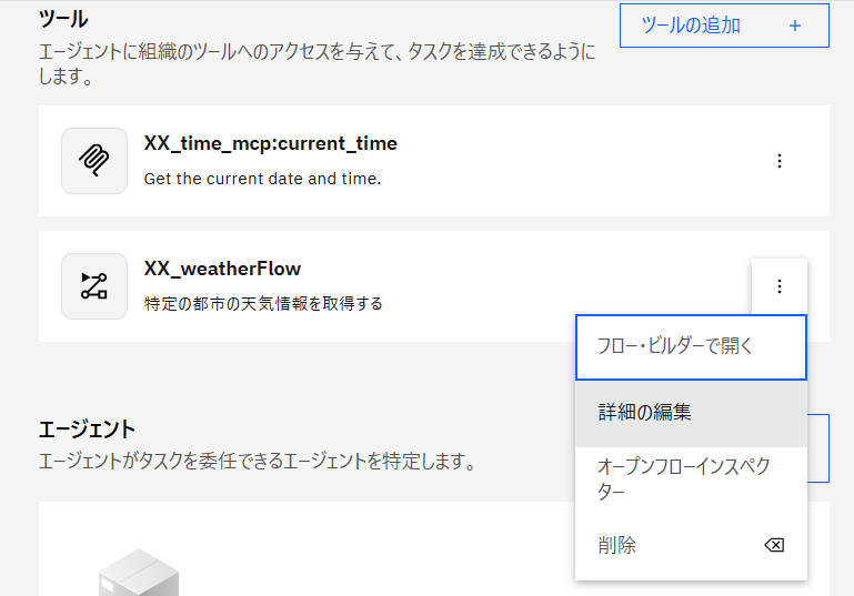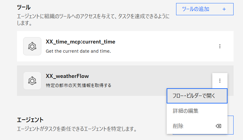 Agent BuilderでXX-IBMInfoを開いた状態で、XX_weatherFlowの縦三点リーダーをクリックして表示されたメニューから 詳細の編集 をクリックします。