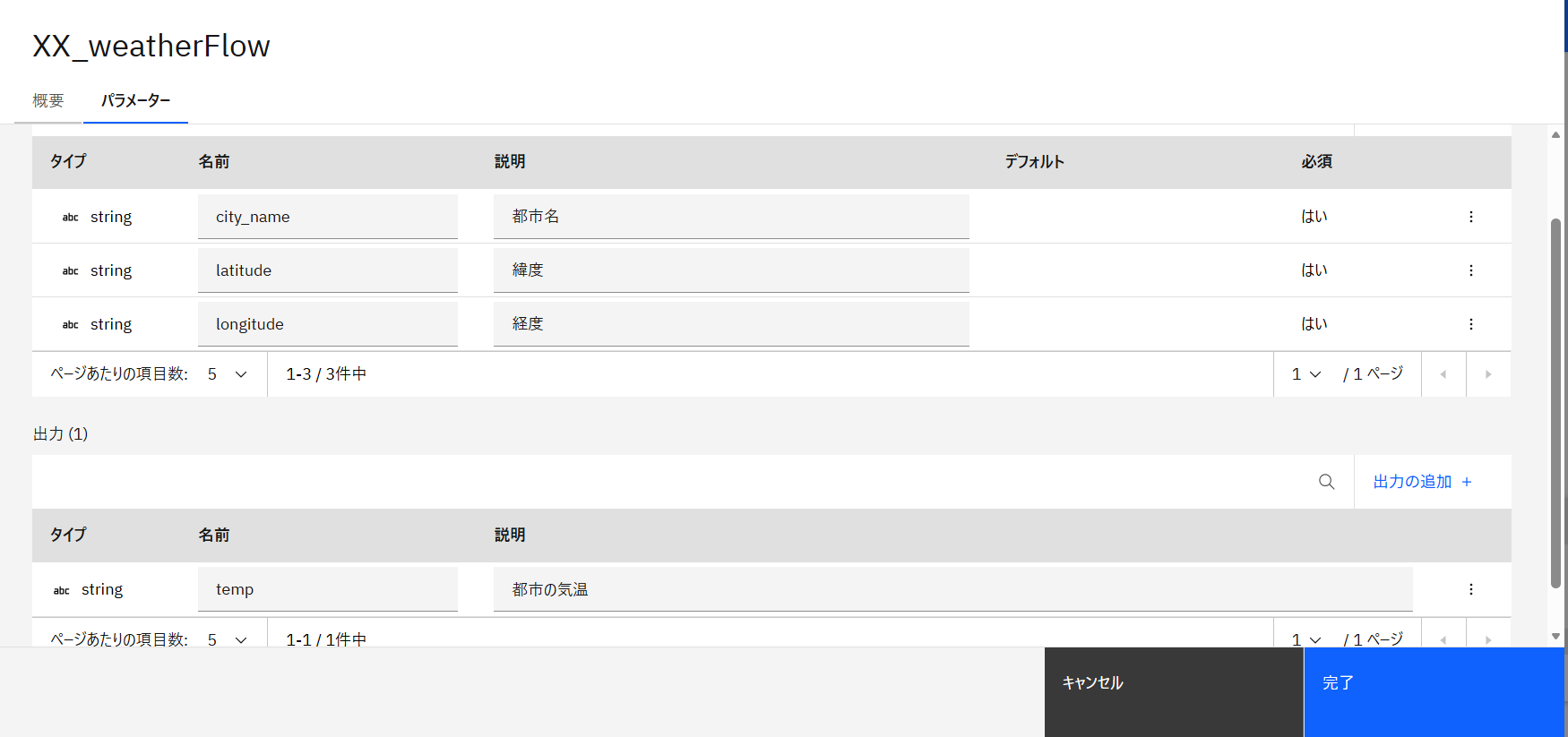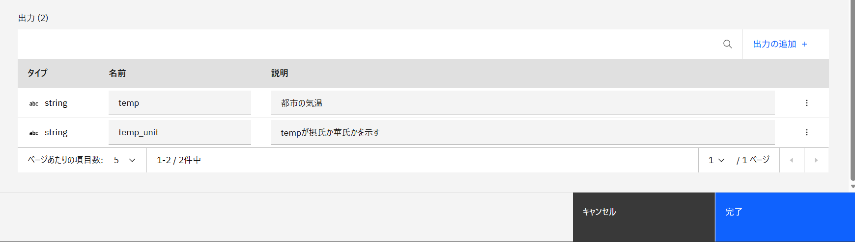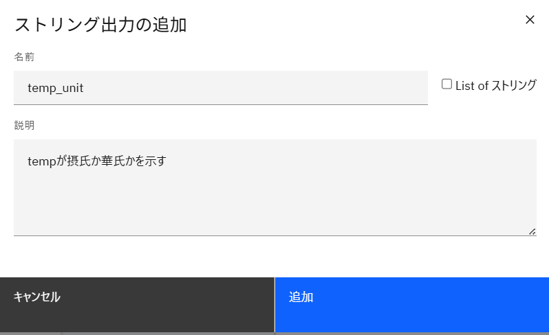 パラメータータブを開きます。出力の追加 ボタンを押してストリングを選択し、次の値を設定後、完了 をクリックします。