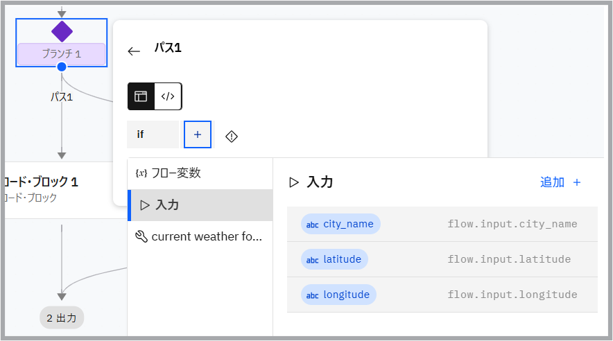 追加したブランチ1と終了の間の矢印(パス1)にカーソルを合わせて+マークをクリックし、表示されたメニューから コード・ブロック を選択します。