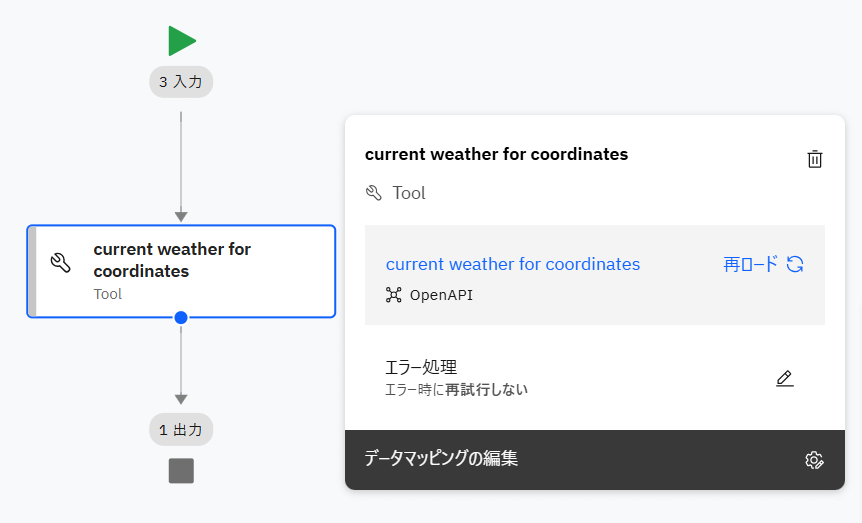 配置したcurrent weather for coordinatesをクリックし、表示された データマッピングの編集 をクリックします。