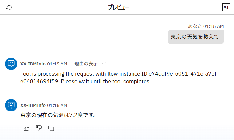 右側のプレビューで「東京の気温を教えて」と尋ねると、フローが呼び出されます。処理は非同期に実施され、応答を待っている間は追加の入力ができません。