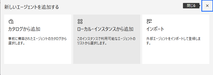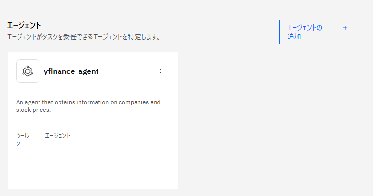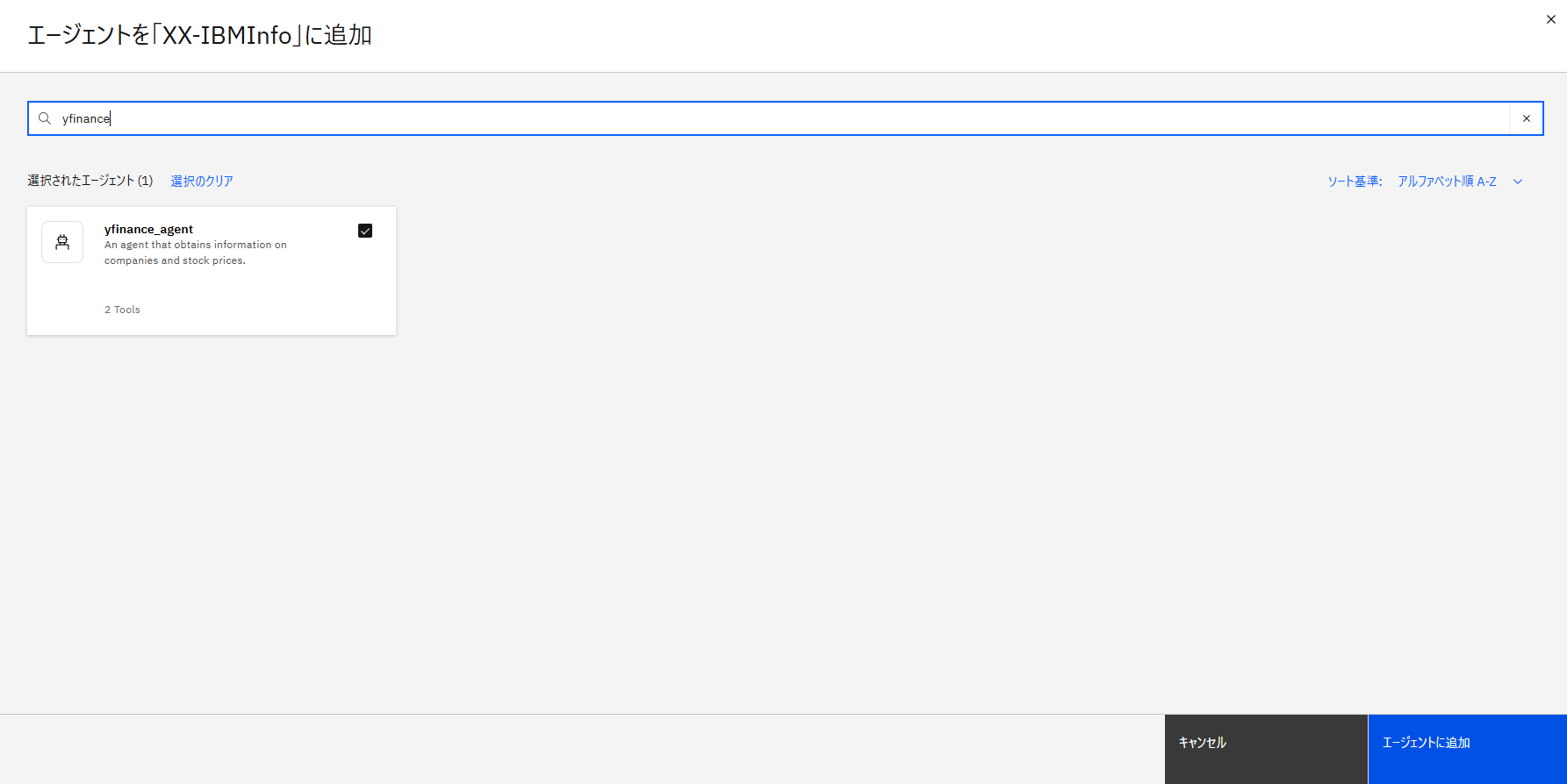 追加可能なAgentのリストが表示されるので、yfinance_agentを選択し、右下のエージェントに追加ボタンをクリックしてください。