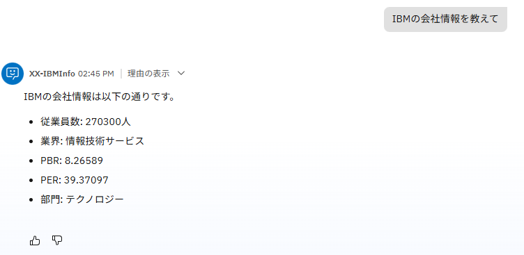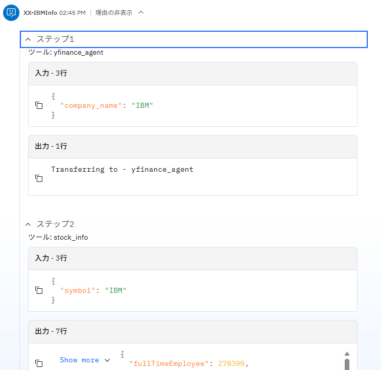 理由の表示をクリックし、ステップを展開して確認してください。おそらく、ステップ1でyfinance_agentに処理が転送され、ステップ2でToolが呼び出されて会社情報を取得しているはずです。