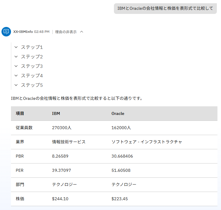 <オプション>IBMとOracleの会社情報と株価を表形式で比較してと入力してどの様な振る舞いになるか確認してみましょう。