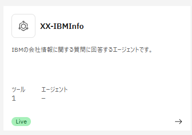 左上のメニューを開き、ビルド > エージェント・ビルダー を選択し、これまで作成してきたXX-IBMInfoエージェントを探して開きます。