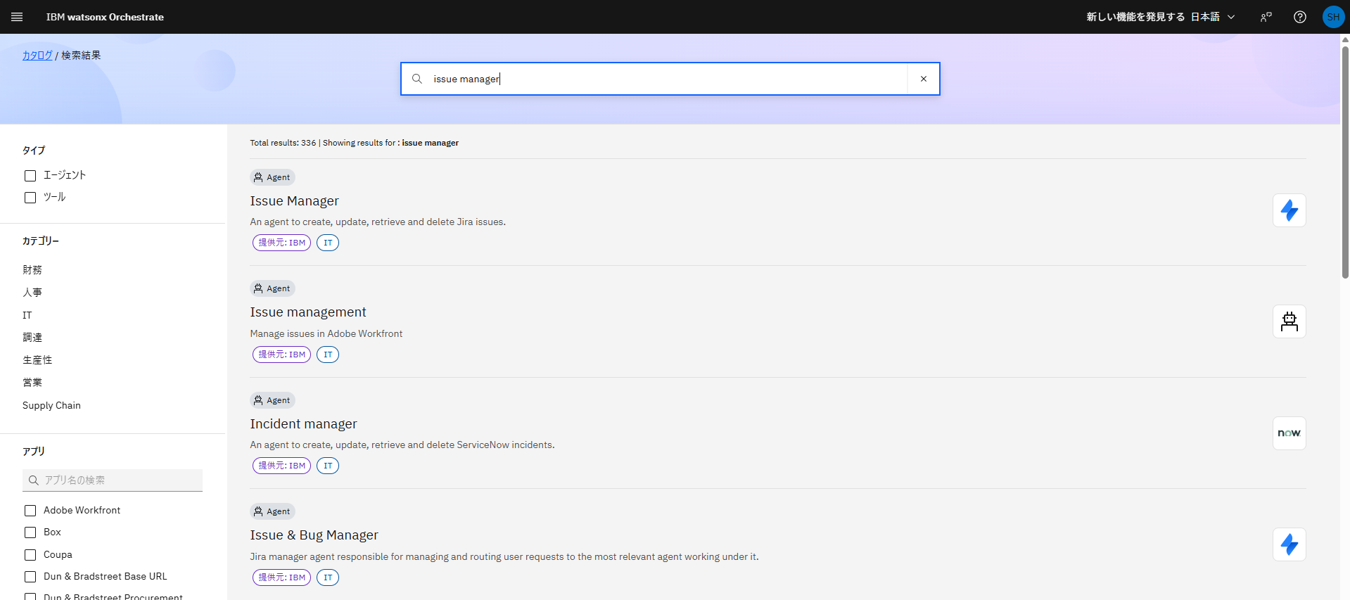 3. 検索Boxにissue managerと入力し、エンターキーを入力してください。Jiraを使用するエージェントが表示されるので、Issue managerを選択してください。
