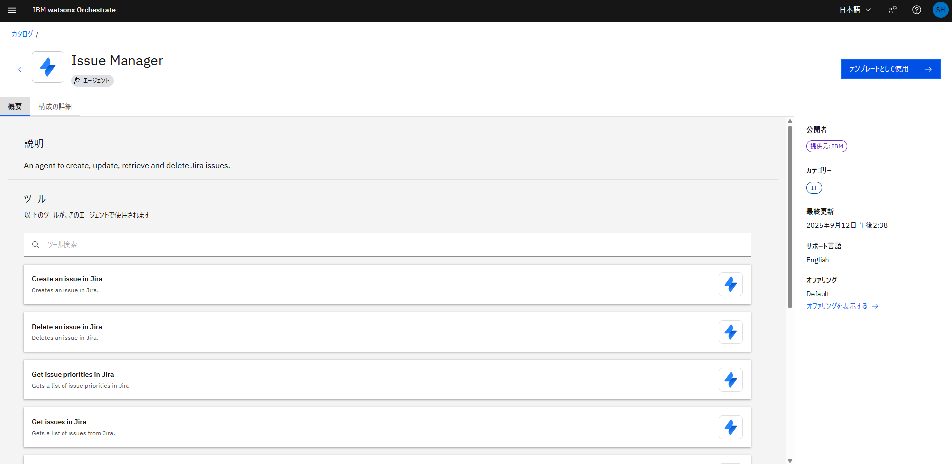 watsonx Orchestrateには、事前定義されたエージェントやツールがカタログに多数含まれ、テンプレートとして利用することが可能です。 また、接続(Connections)という仕組みを使うことで、接続情報を柔軟に管理、設定することが可能です。 このLabでは、Jiraへ接続可能なエージェントをテンプレートから構成し、利用する手順について説明します。