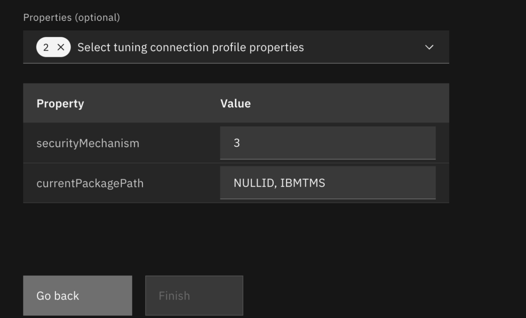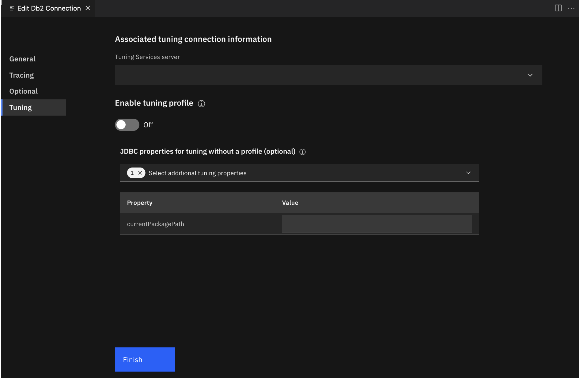 Optionally, you can specify JDBC properties when creating a tuning profile. Db2 Developer Extension supports the following JDBC properties: