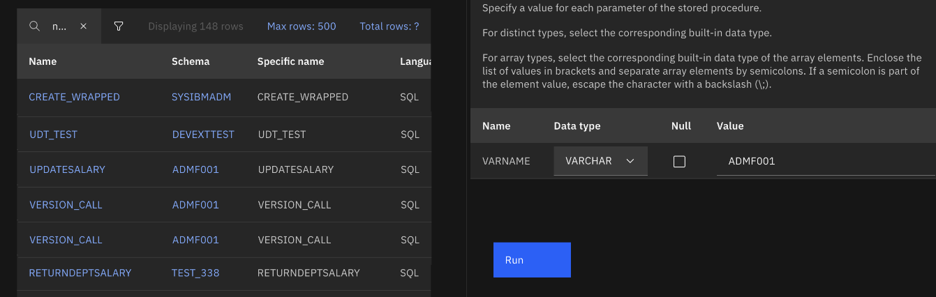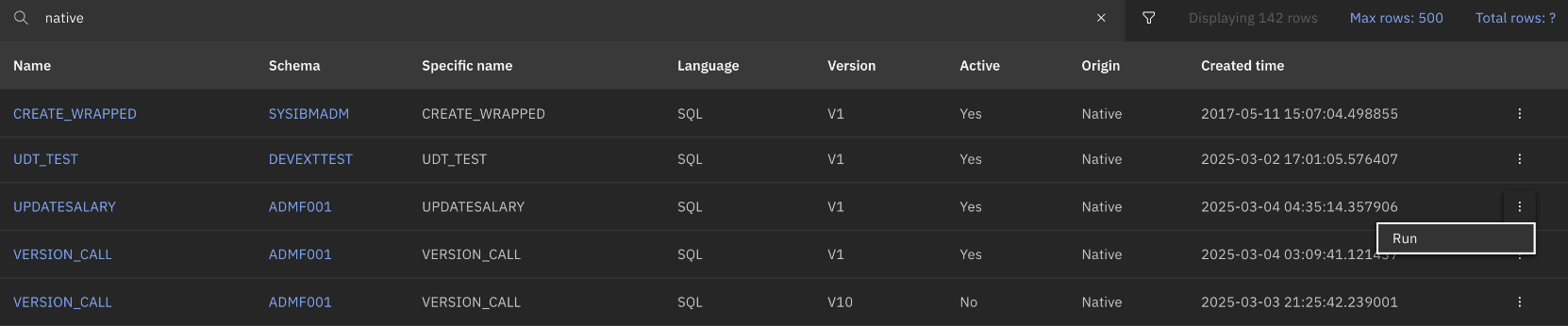 To call a stored procedure or user-defined function, first select the Stored procedure or User-defined function object type from the catalog navigation tree, then click Run from the overflow menu for the stored procedure or UDF that you want to call: