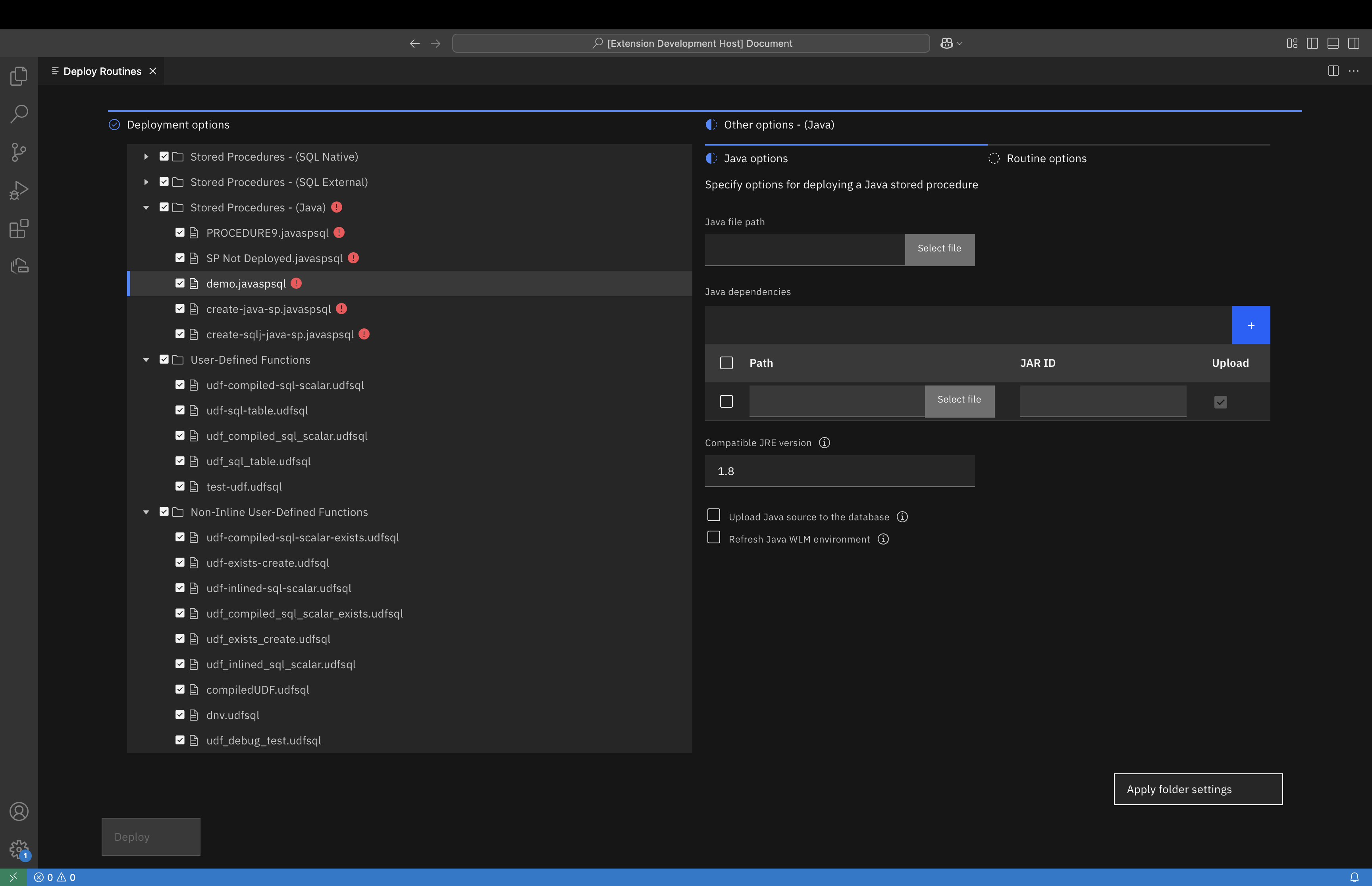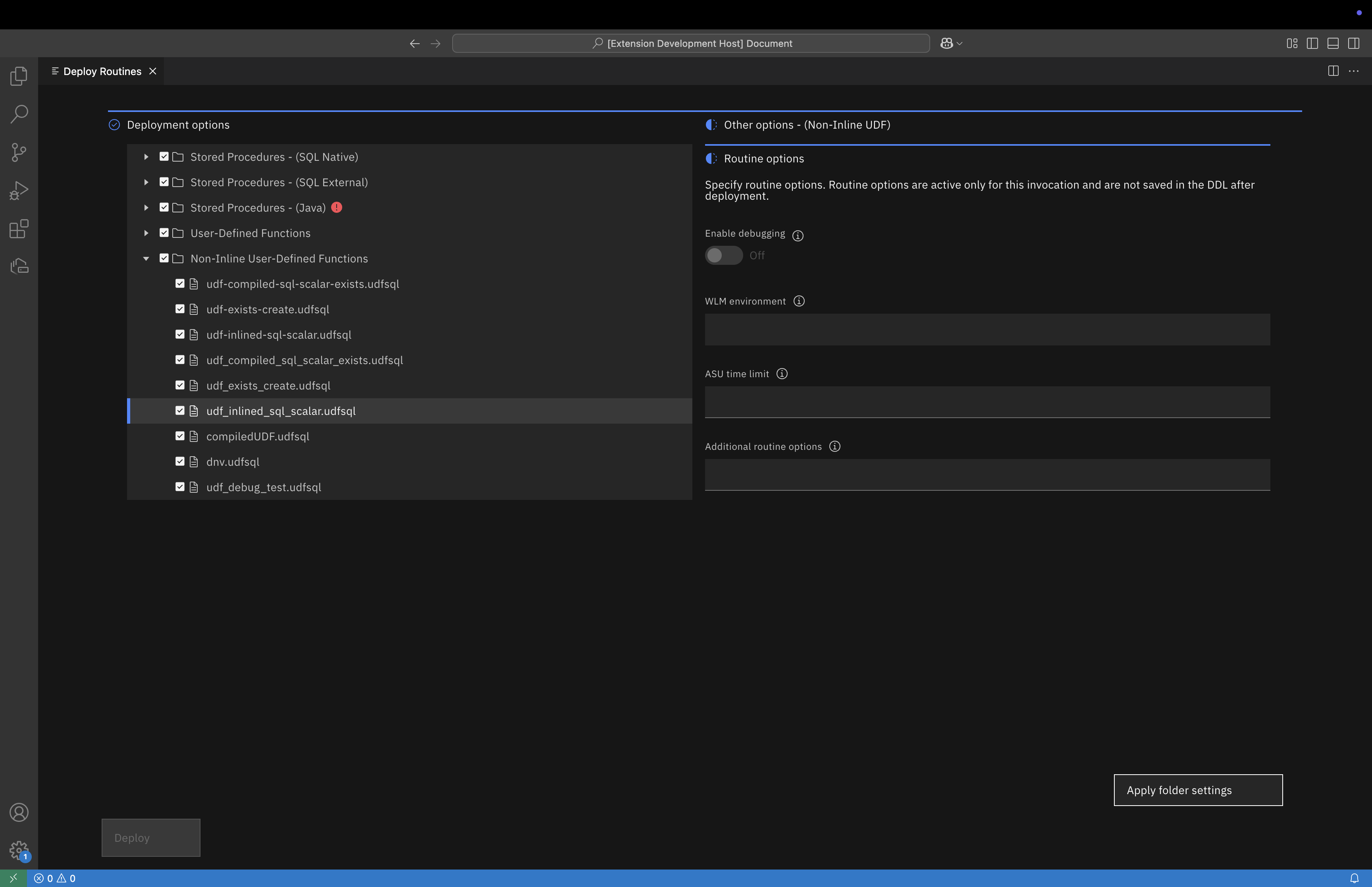 - Select multiple individual stored procedure or UDF files, one or more folders that contain stored procedure or UDF files, or a combination of files and folders. Then right-click and select Deploy Routines from the context menu.