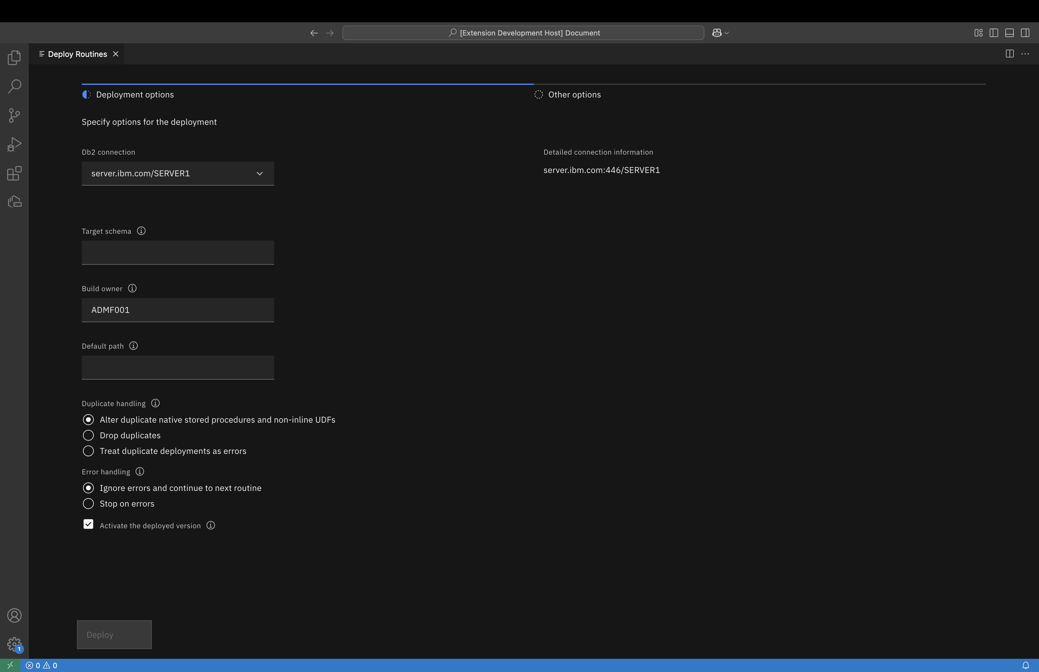 Click the Other options tab to specify additional deployment parameters. A list of the routines that you selected is displayed alongside additional deployment options. The tabs that are displayed will vary depending on the type of routine that you are working with: