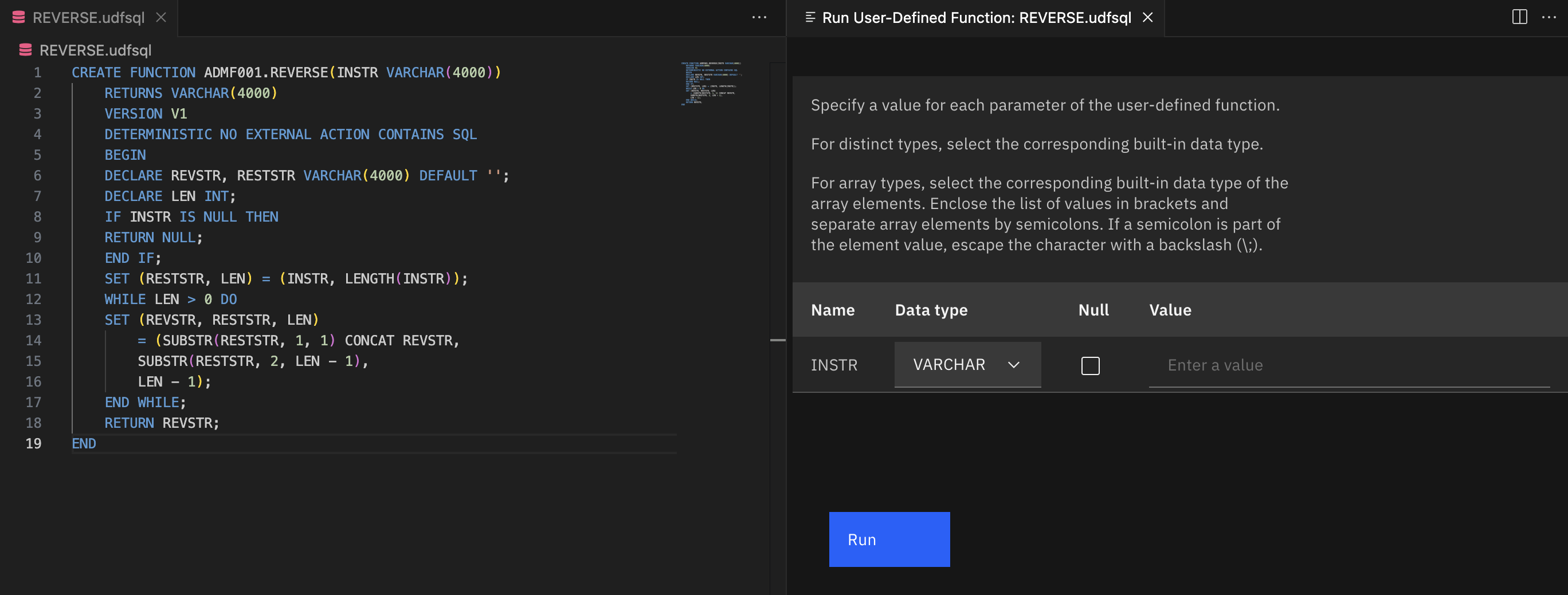 Here’s how that same SQL user-defined function looks in Db2 Developer Extension:
