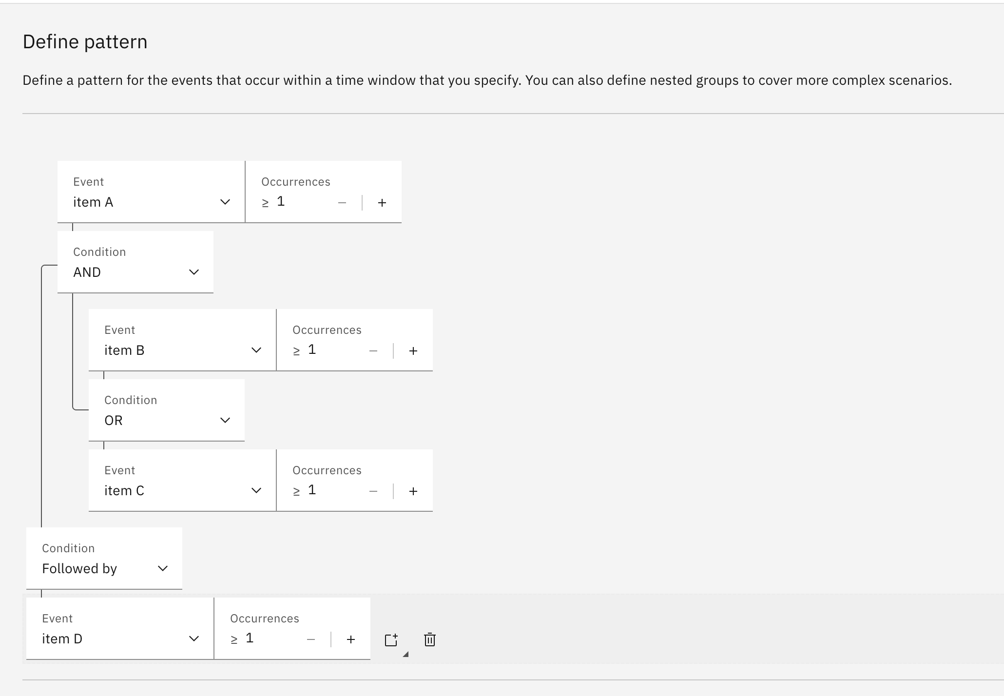 When building complex patterns, conditions have different levels of precedence. The UI represents this by using visual groups. For example, when building the pattern