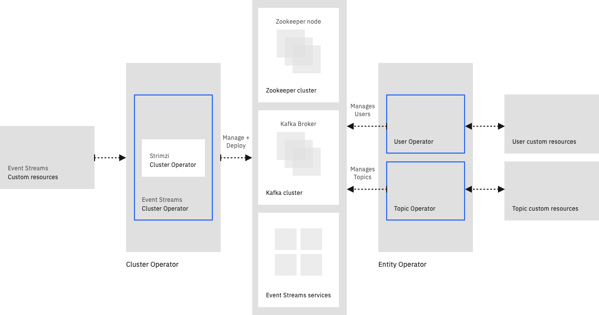 The EventStreams Cluster Operator extends the Strimzi Cluster Operator to provision the additional components provided by Event Streams alongside these core components. A new custom resource Type called EventStreams is provided to manage this overall deployment.