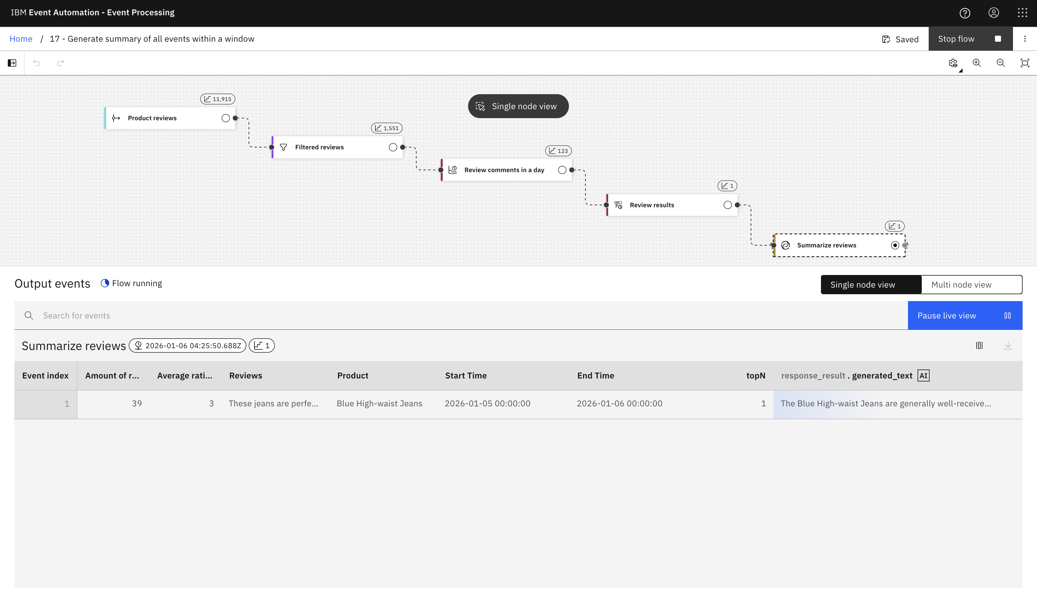 As a retailer, you want to analyze customer reviews for your product to identify trends, sentiment, and areas for improvement. You have a large dataset of reviews with timestamps, and want to generate a summary of all events within a specific time window. To achieve this, you can use the watsonx.ai node.