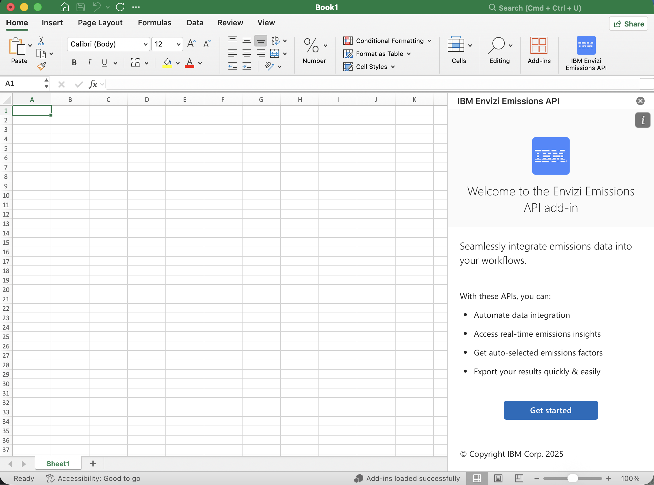 This guide explains how to install the IBM Envizi Emissions API add-in from the Microsoft Marketplace on macOS.