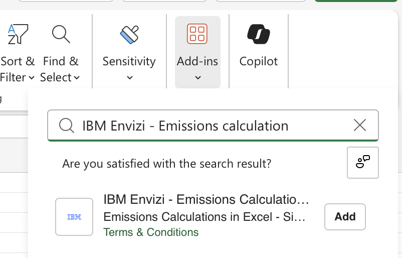 In the search box of the Add-ins dialog box, type IBM Envizi - Emissions calculation and press Enter.