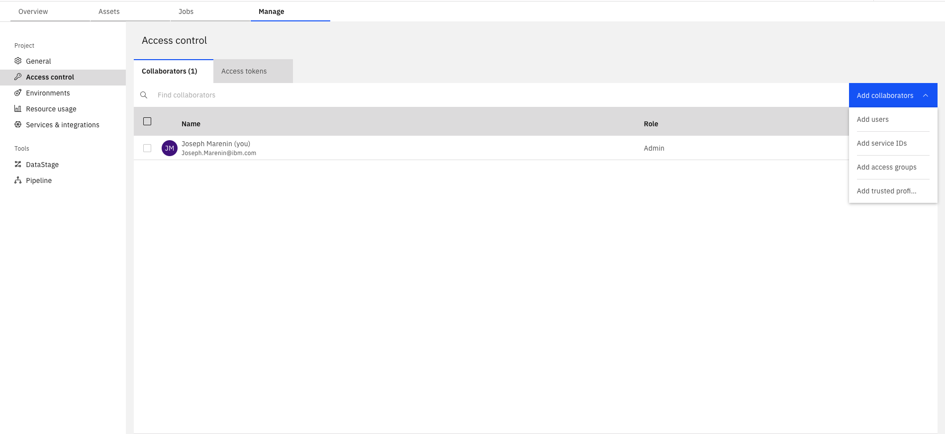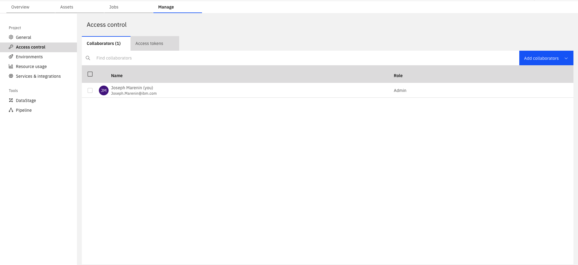 >>> project.collaborators.get(user_name='myuser@ibm.com')