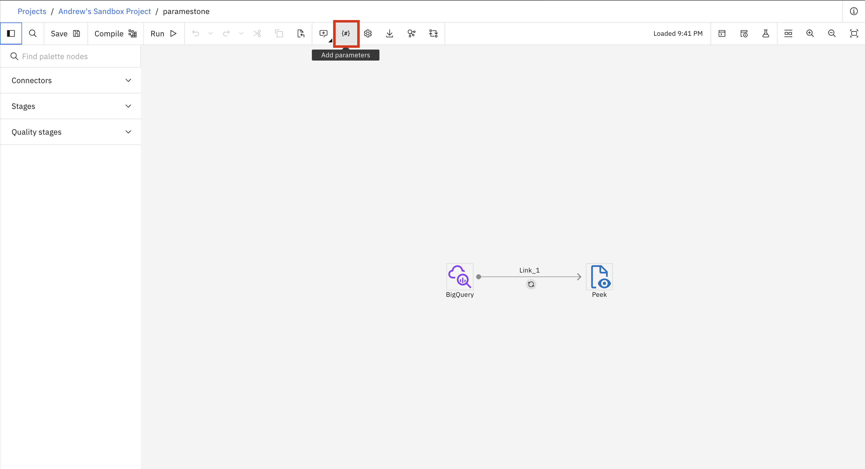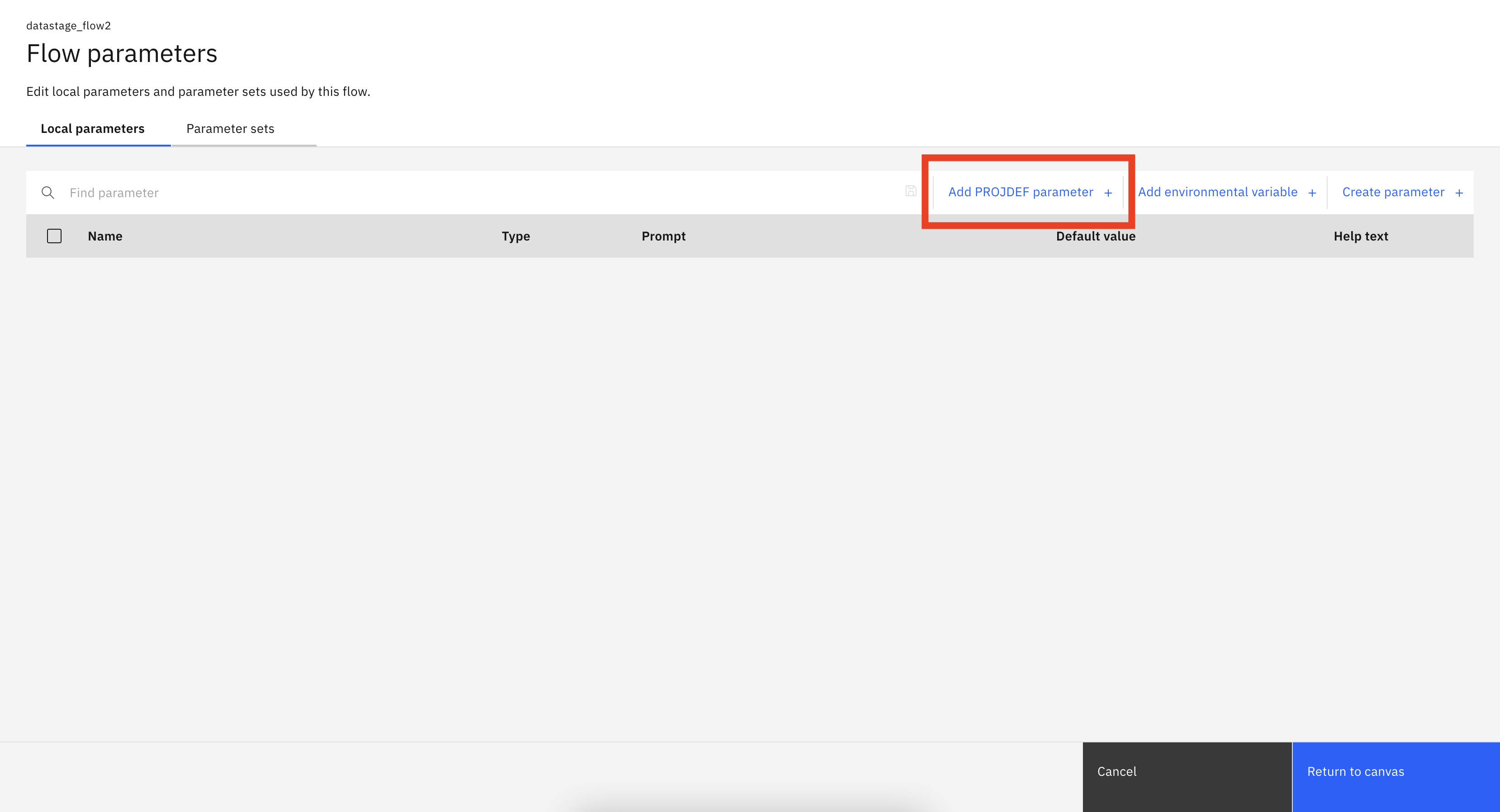 You can use the PROJDEF parameter set to contain the parameters and environment variable values for a DataStage flow, job, or job run to reference. You can read more about PROJDEF here. To add PROJDEF in the UI go to Flow parameters -> Add PROJDEF parameter