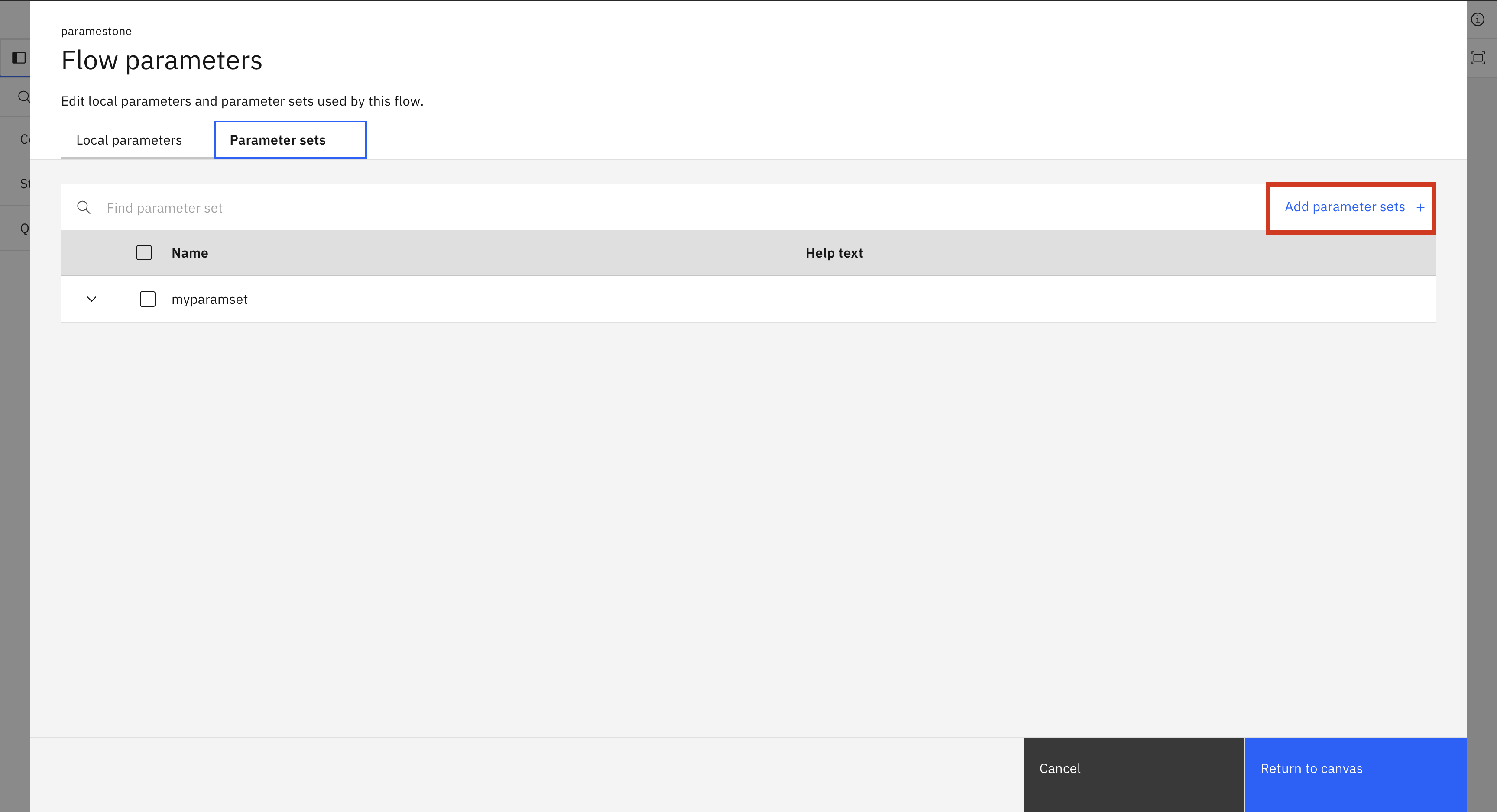 In the UI, you can use a Parameter Set in a flow by navigating to Flow parameters -> Parameter sets -> Add parameter sets and choosing the desired parameter set from the list.