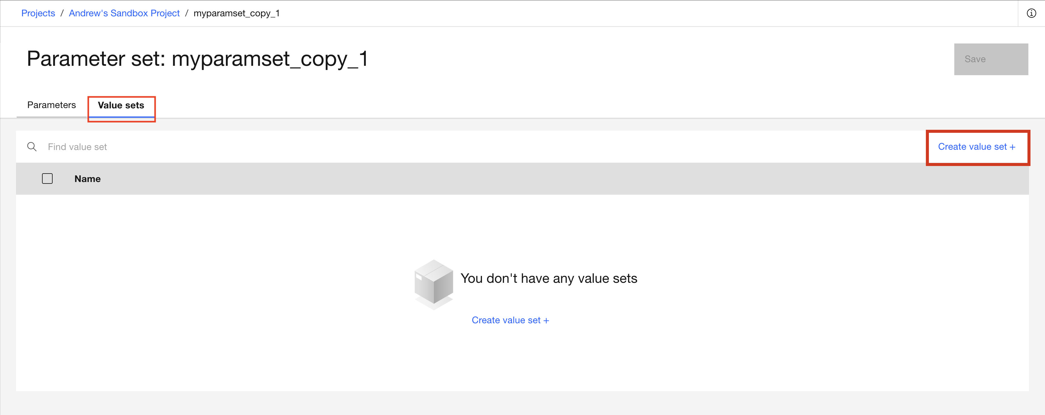 Value sets let you assign different values to the parameters in a parameter set. In the UI, to create a value set first navigate to Assets -> Configurations -> Parameter sets and click the name of the Parameter Set you want to edit. Then, click the Value sets tab to create, edit, or delete a value set.